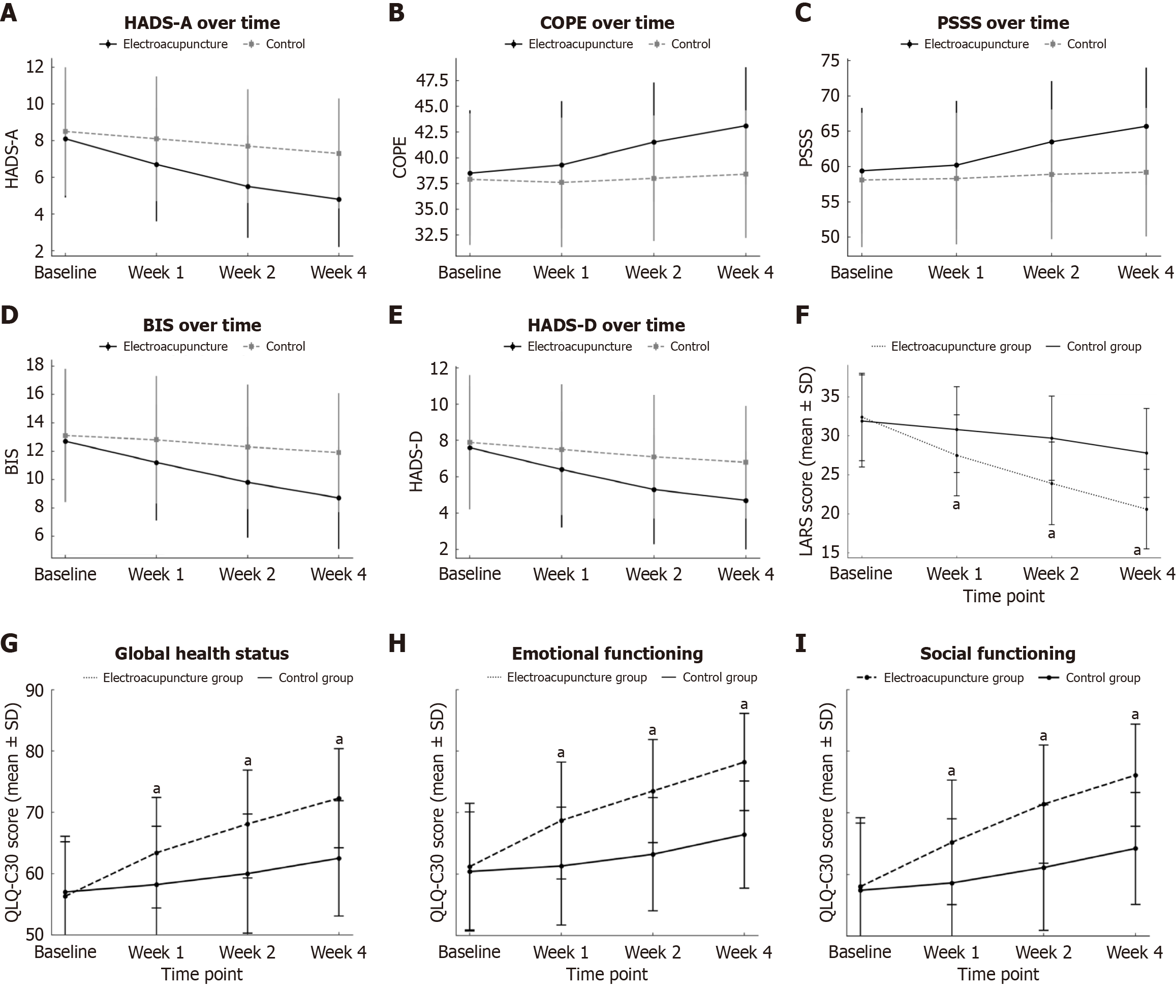 A–E: Changes in psychological outcomes over the 4-week intervention period. Line graphs illustrate the temporal trends of anxiety (Hospital Anxiety and Depression Scale–Anxiety subscale), coping strategy (Brief Coping Orientation to Problems Experienced), perceived social support (Perceived Social Support Scale), body image disturbance (Body Image Scale), and depression (Hospital Anxiety and Depression Scale–Depression subscale) in the electroacupuncture and control groups. Error bars indicate standard deviations. F: Change in low anterior resection syndrome scores over time in the electroacupuncture and control groups. Data are presented as mean ± SD. G–I: Changes in global health status, emotional functioning, and social functioning over time, derived from the European Organization for Research and Treatment of Cancer Quality of Life Questionnaire Core 30. Higher scores indicate better functioning. Superscript “a” indicates statistically significant differences (P < 0.05) observed from week 1 onward in the electroacupuncture group compared with baseline and the control group. HADS-A: Hospital Anxiety and Depression Scale-Anxiety subscale; COPE: Coping Orientation to Problems Experienced; PSSS: Perceived Social Support Scale; BIS: Body Image Scale; HADS-D: Hospital Anxiety and Depression Scale-Depression subscale; LARS: Low anterior resection syndrome; QLQ-C30: Quality of Life Questionnaire Core 30 questionnaire.