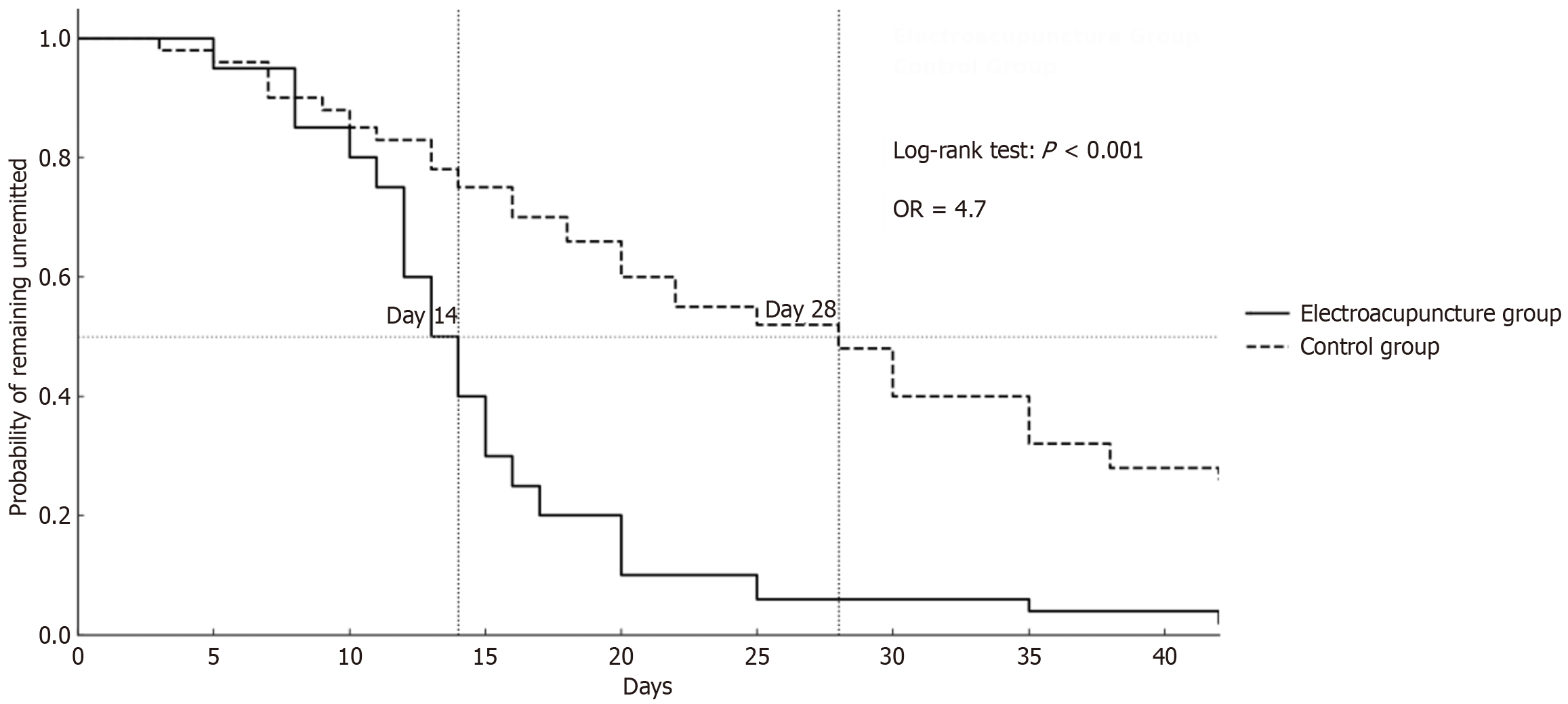 Kaplan-Meier curves illustrate the time to emotional remission, defined as a ≥ 3-point reduction in Hospital Anxiety and Depression Scale-Anxiety subscale scores, in patients receiving electroacupuncture vs standard care. The electroacupuncture group exhibited a significantly faster response onset (log-rank test: P < 0.001; odds ratio = 4.7). Vertical reference lines mark days 14 and days 28. OR: Odds ratio.
