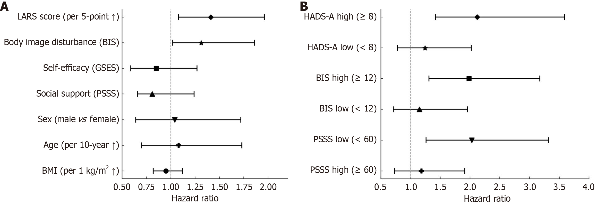 Forest plot showing adjusted hazard ratios (HRs) with 95% confidence intervals for time to emotional remission and psychological subgroups (defined as Hospital Anxiety and Depression Scale-Anxiety subscale reduction ≥ 3 points) based on multivariate Cox regression (model 2). A: Forest plot of multivariate Cox regression for emotional remission (model 2). The model was adjusted for sex, age, body mass index, low anterior resection syndrome score, Body Image Scale, General Self-Efficacy Scale, and Perceived Social Support Scale. HRs > 1 indicate a higher likelihood of earlier emotional remission. Symbols represent individual variables, and the vertical dashed line at HR = 1 denotes the null value; B: Subgroup analysis of electroacupuncture effect on emotional remission. Subgroup stratifications were based on baseline anxiety level (Hospital Anxiety and Depression Scale-Anxiety subscale), body image disturbance (Body Image Scale), and perceived social support (Perceived Social Support Scale). Significant heterogeneity in treatment effect was observed, with greater benefit in patients with higher baseline psychological burden. The vertical dashed line indicates HR = 1. Symbols represent subgroup strata. LARS: Low anterior resection syndrome; BIS: Body Image Scale; GSES: General Self-Efficacy Scale; PSSS: Perceived Social Support Scale; BMI: Body mass index; HADS-A: Hospital Anxiety and Depression Scale-Anxiety subscale.