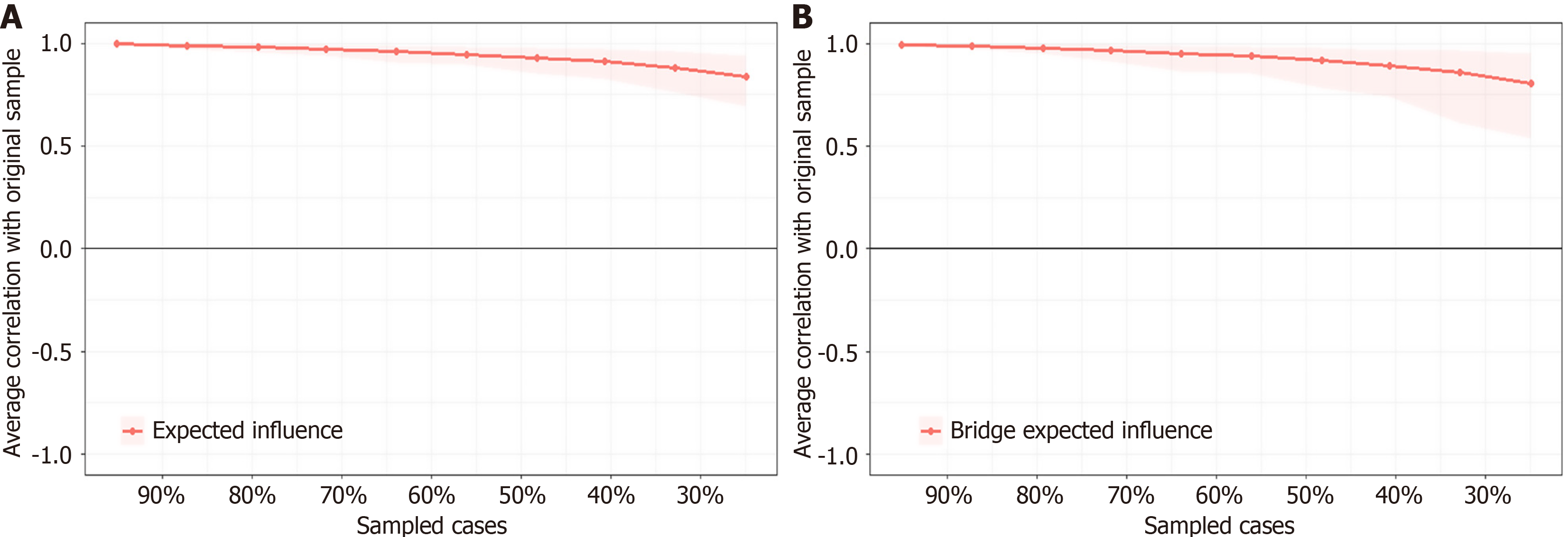 A: The red bar indicates the average correlation between expected influence values across bootstrap samples, reflecting the stability of the centrality estimates. Higher values suggest more reliable and stable measurements of symptom influence within the network; B: The red bar indicates the average correlation between bridge expected influence values across bootstrap samples, reflecting the stability of the centrality estimates. Higher values suggest more reliable and stable measurements of symptom influence within the network.