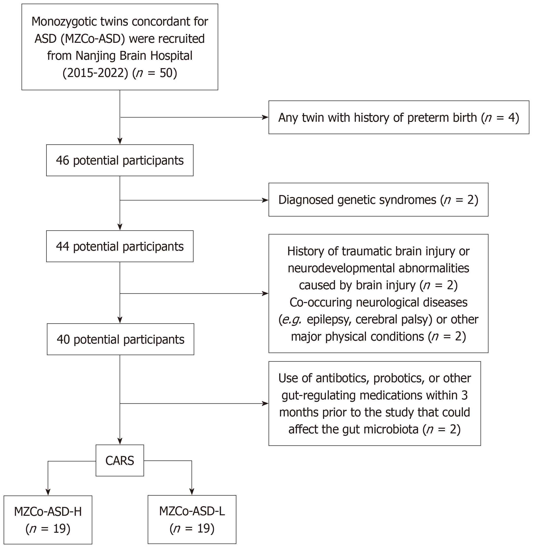 ASD: Autism spectrum disorder; MZCo-ASD: Monozygotic twins with autism spectrum disorder; CARS: Childhood Autism Rating Scale; MZCo-ASD-H: Severe monozygotic twins with autism spectrum disorder; MZCo-ASD-L: Monozygotic twins with autism spectrum disorder-mild group.