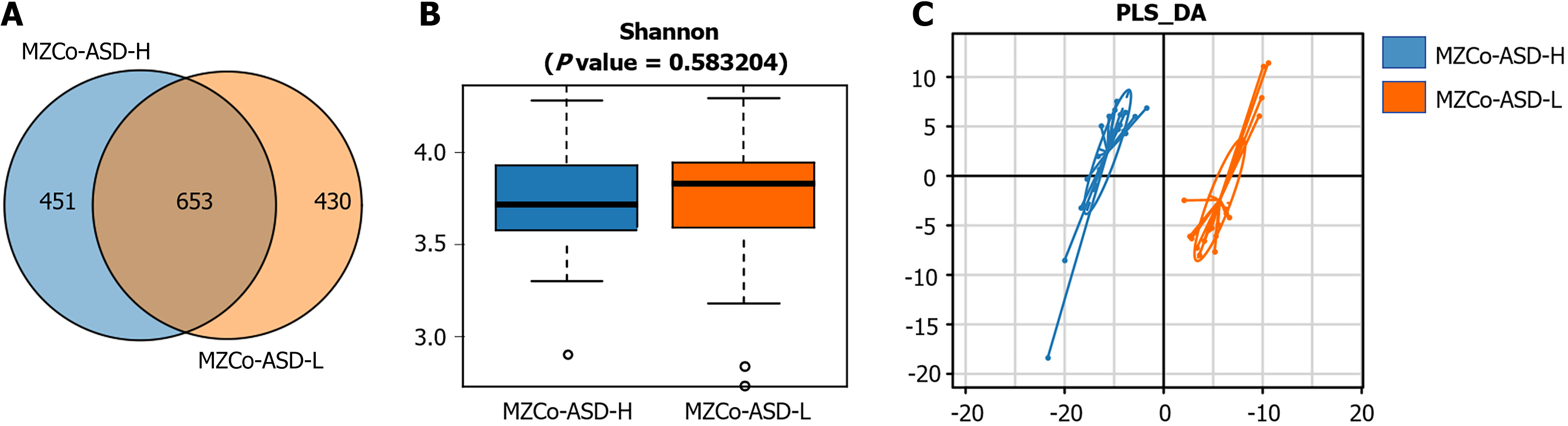 A: Venn diagram highlights the overlapping area representing shared operational taxonomic unit between the two groups; B: The alpha diversity of the severe monozygotic twins with autism spectrum disorder group (blue) and the monozygotic twins with autism spectrum disorder-mild group (orange); C: The beta diversity of severe monozygotic twins with autism spectrum disorder group (blue) and the monozygotic twins with autism spectrum disorder-mild group (orange). The distance between the two groups reflects their similarity. MZCo-ASD-H: Severe monozygotic twins with autism spectrum disorder; MZCo-ASD-L: Monozygotic twins with autism spectrum disorder-mild group; PLS-DA: Partial least squares discriminant analysis.
