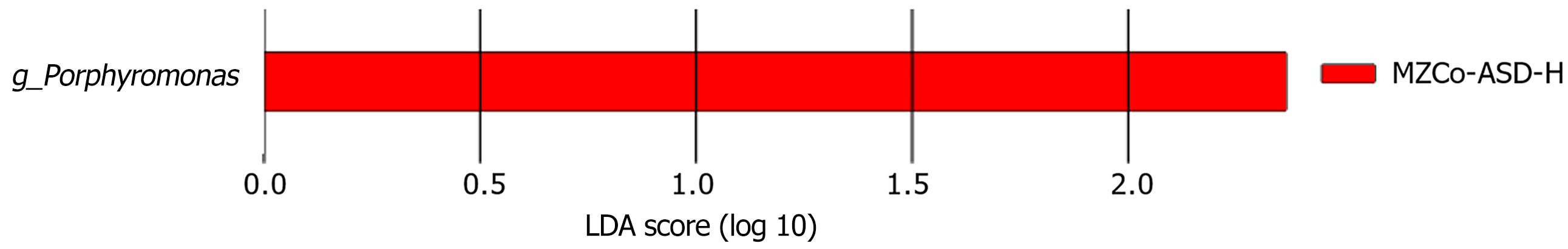 This shows the enriched species of severe monozygotic twins with autism spectrum disorder identified through linear discriminant analysis. The horizontal axis displays the linear discriminant analysis score ranging from 0.0 to 2.0, while the vertical axis depicts various taxonomic units. MZCo-ASD-H: Severe monozygotic twins with autism spectrum disorder; LDA: Linear discriminant analysis.