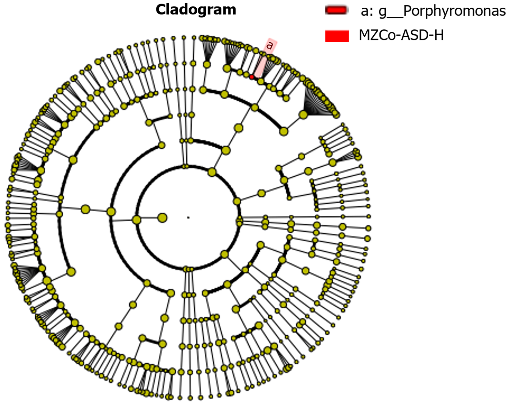 The phylogenetic cladogram visualized the relationships between microbial communities and the differences among groups. Each dot represents a taxonomic unit, from phylum to genus. Yellow dots indicate nodes with no significant differences, while red dots represent nodes that are significantly more common in the severe monozygotic twins with autism spectrum disorder group. The red-highlighted area emphasizes the genus Porphyromonas and its related branches. The cladogram indicates that the genus Porphyromonas has distinct branches and red clusters in the outer circle of the phylogenetic tree. MZCo-ASD-H: Severe monozygotic twins with autism spectrum disorder.