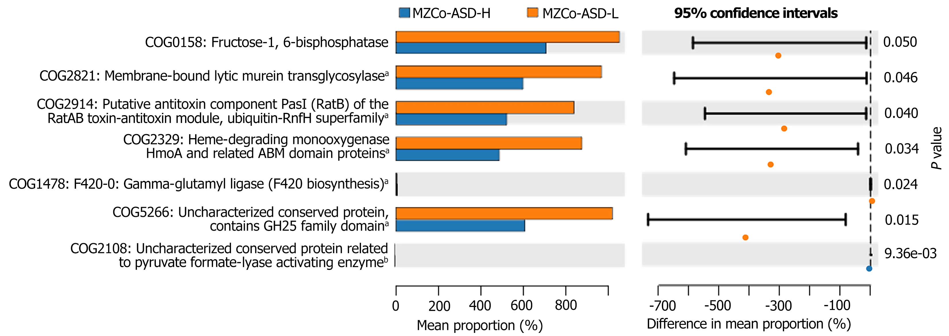 aP < 0.05, bP < 0.05; MZCo-ASD-H: Severe monozygotic twins with autism spectrum disorder; MZCo-ASD-L: Monozygotic twins with autism spectrum disorder-mild group; COG: Clusters of Orthologous Groups; ABM: Antibiotic monooxygenase; F420: Coenzyme F420; GH: Glycoside hydrolase.