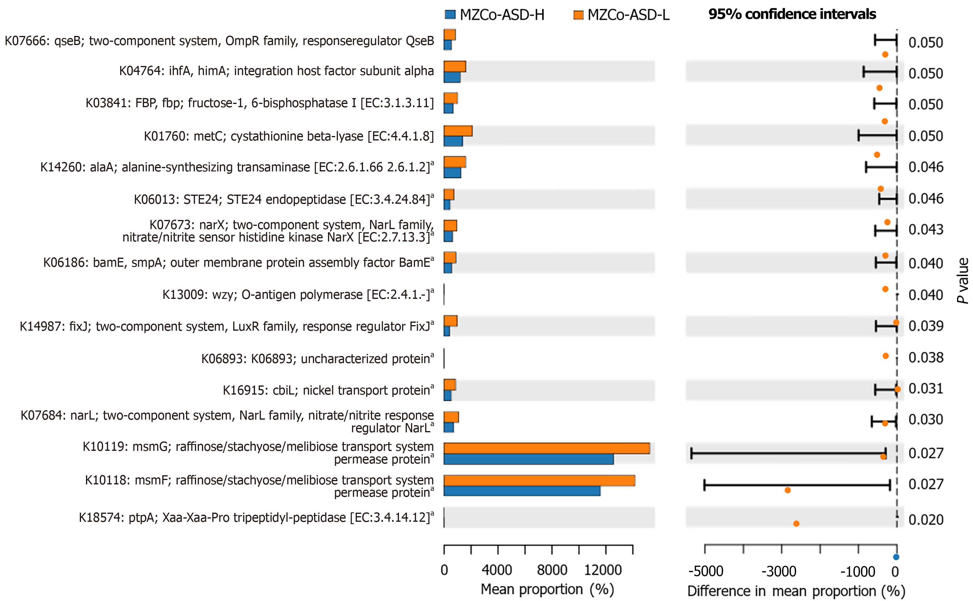 aP < 0.05; MZCo-ASD-H: Severe monozygotic twins with autism spectrum disorder; MZCo-ASD-L: Monozygotic twins with autism spectrum disorder-mild group; FBP: Fructose-1,6-bisphosphatase; EC: Enzyme commission; STE24: Zinc metalloprotease STE.