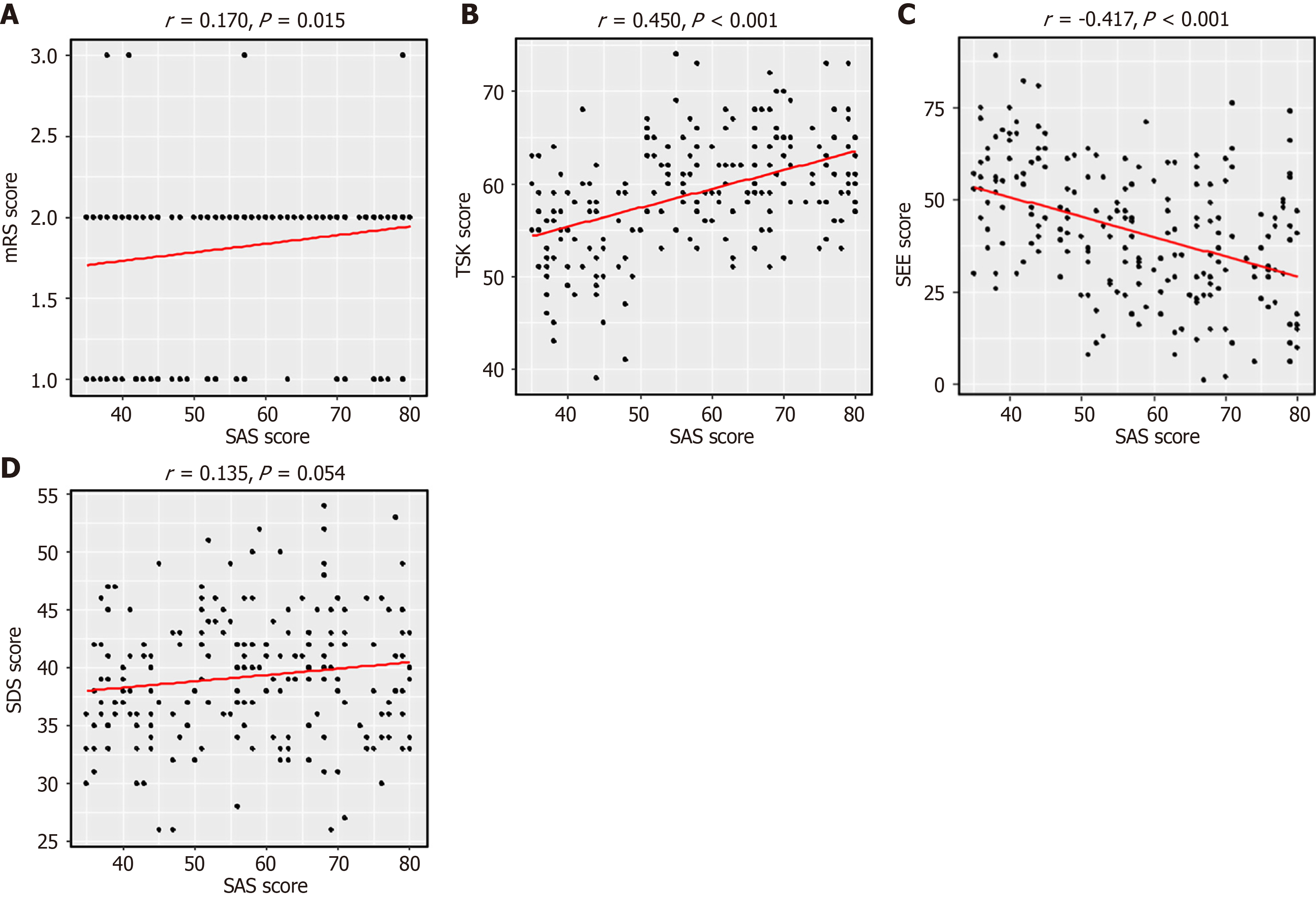 A: Correlation analysis between Self-Rating Anxiety Scale (SAS) score and Modified Rankin Scale score; B: Correlation analysis between SAS score and Tampa Scale for Kinesiophobia score; C: Correlation analysis between SAS score and Self-Efficacy for Exercise Scale score; D: Correlation analysis between SAS score and Self-Rating Depression Scale score. mRS: Modified Rankin Scale; TSK: Tampa Scale for Kinesiophobia; SEE: Self-Efficacy for Exercise Scale; SDS: Self-Rating Depression Scale; SAS: Self-Rating Anxiety Scale.