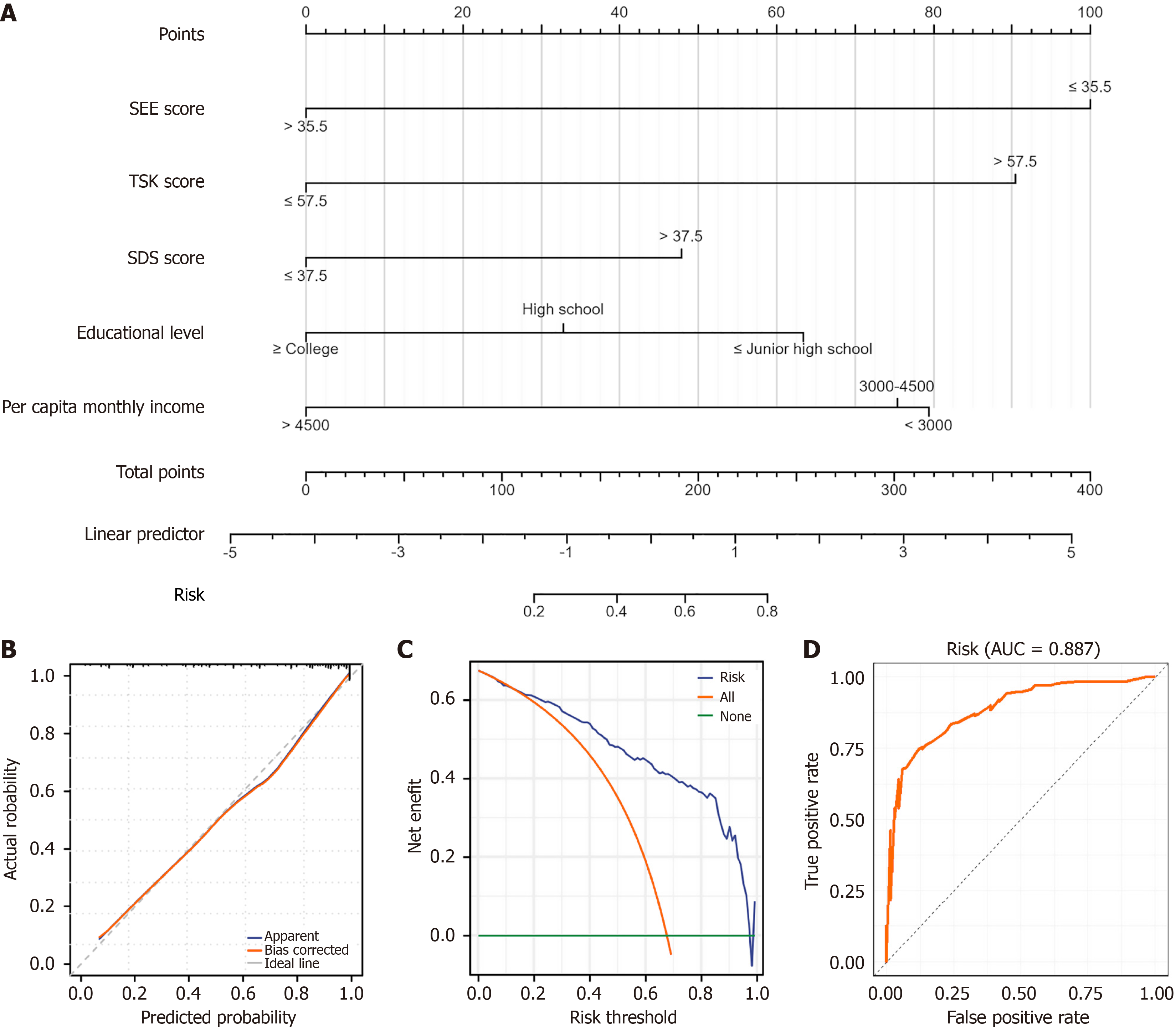 A: Line graph of the exercise anxiety prediction model; B: Calibration curve to assess the stability of the predictive model; C: Decision curve analysis model to assess the clinical benefit rate of the prediction model; D: Receiver operating characteristic curve to assess the predictive efficacy of the prediction model. SEE: Self-Efficacy for Exercise Scale; TSK: Tampa Scale for Kinesiophobia; SDS: Self-Rating Depression Scale; AUC: Area under the curve.