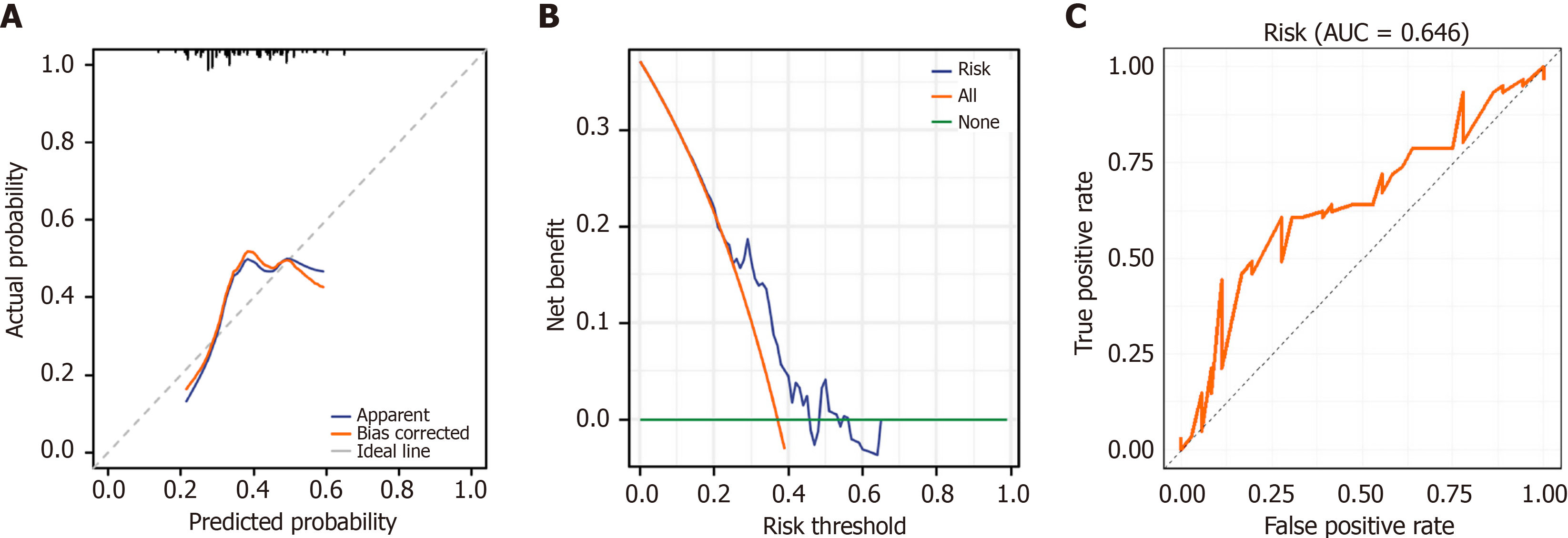 A: Calibration curves to assess the stability of the predictive model; B: Decision curve analysis model to assess the clinical benefit rate of the predictive model; C: Receiver operating characteristic curve to assess the predictive efficacy of the prediction model. AUC: Area under the curve.