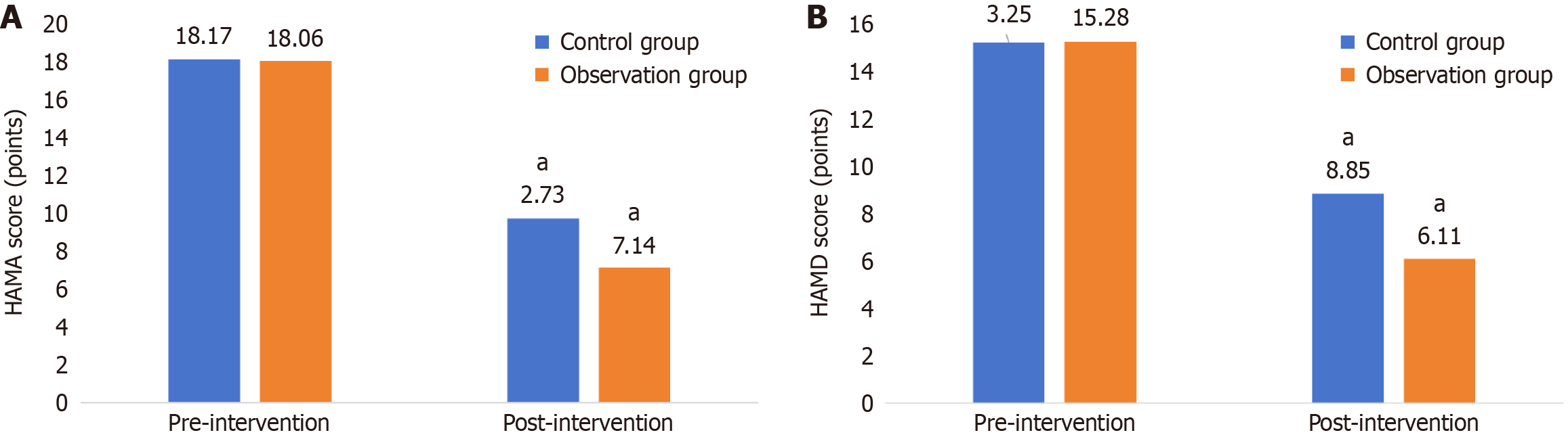 aP < 0.05 vs pre-intervention in the same group. A: Hamilton Anxiety Scale score comparison; B: Hamilton Depression Scale score comparison. HAMA: Hamilton Anxiety Scale; HAMD: Hamilton Depression Scale.