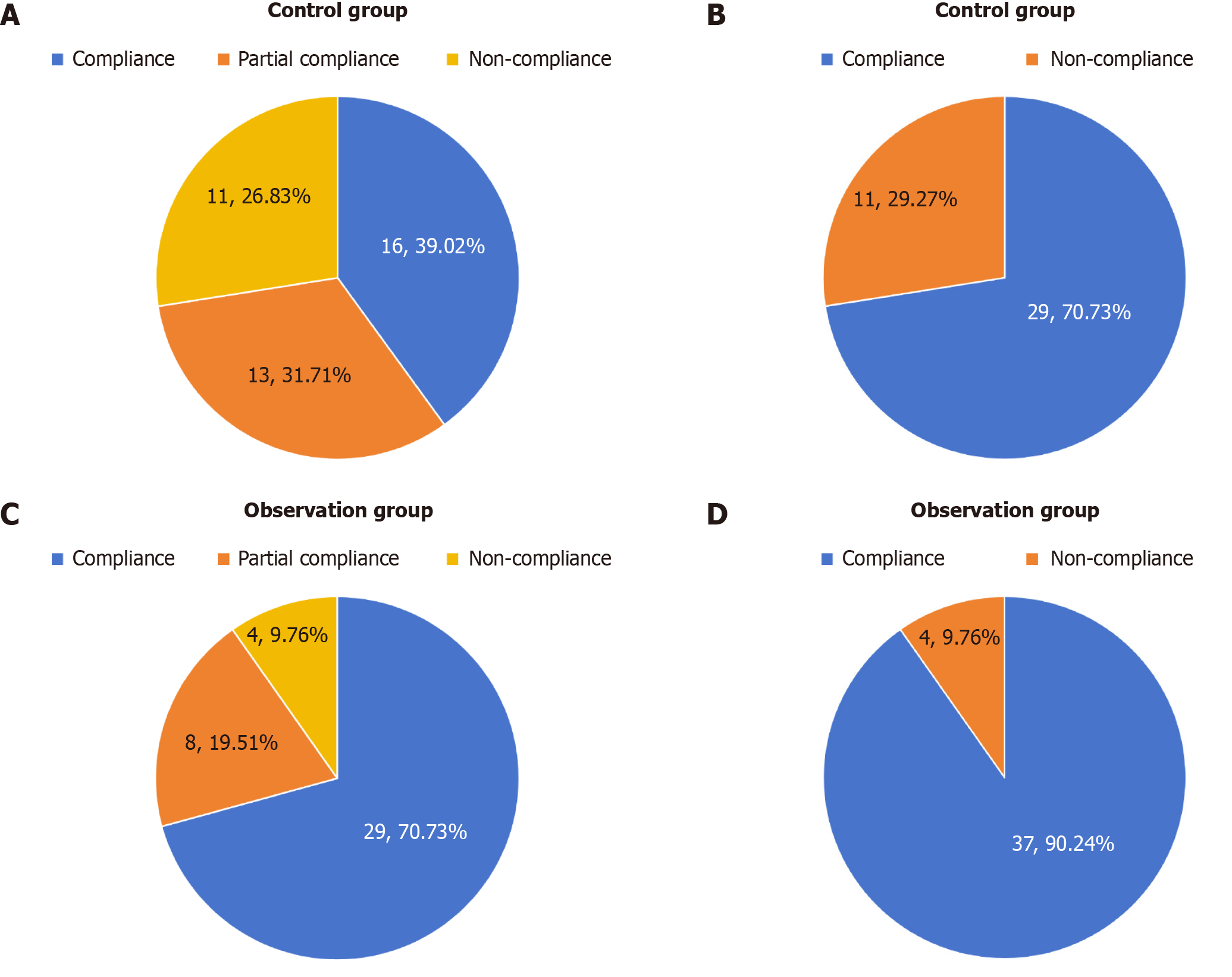 A: Compliance of control group; B: Compliance rate to medication in control group; C: Compliance of medication in observation group; D: Compliance rate to medication in observation group.