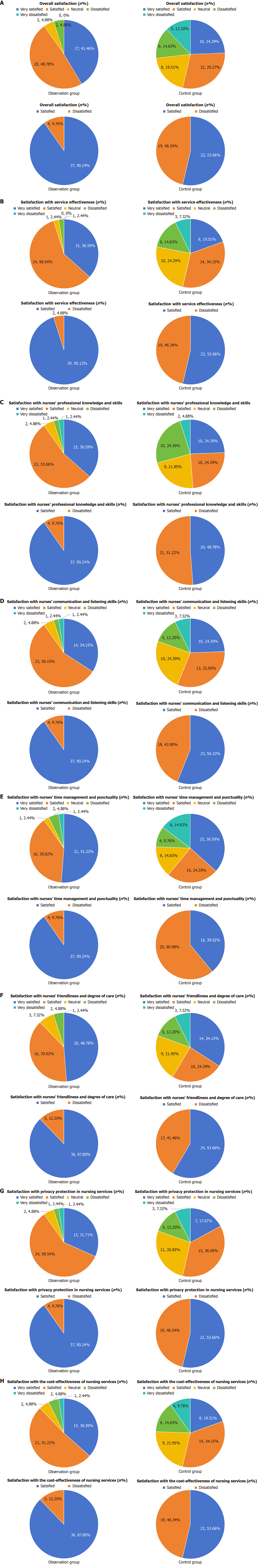 A: Overall satisfaction to out-of-hospital nursing in two groups; B: Satisfaction to out-of-hospital nursing service in two groups; C: Satisfaction to professional knowledge and skill of nurses in two groups; D: Satisfaction to communication and listening ability of nurses in two groups; E: Satisfaction to time management and punctuality of nurses in two groups; F: Satisfaction to friendliness and care of nurses in two groups; G: Satisfaction to privacy protection of nursing services in two groups; H: Satisfaction to cost rationality of nursing service in two groups.