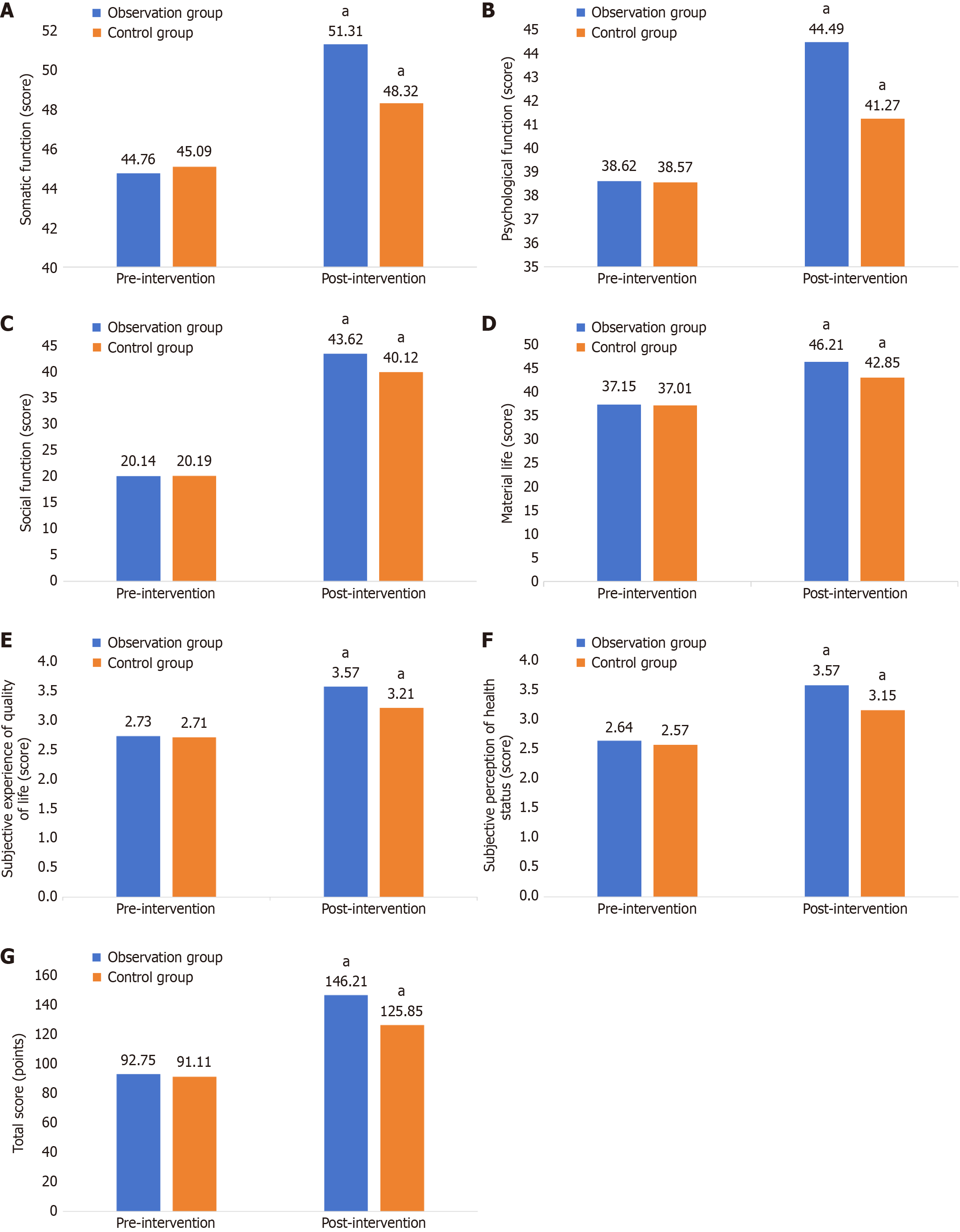aP < 0.05 vs pre-intervention in the same group. A: Comparison of physical function scores; B: Comparison of psychological function scores; C: Comparison of social function scores; D: Comparison of material life scores; E: Comparison of subjective feeling scores of quality of life; F: Comparison of subjective feeling scores of health status; G: Total score comparison.