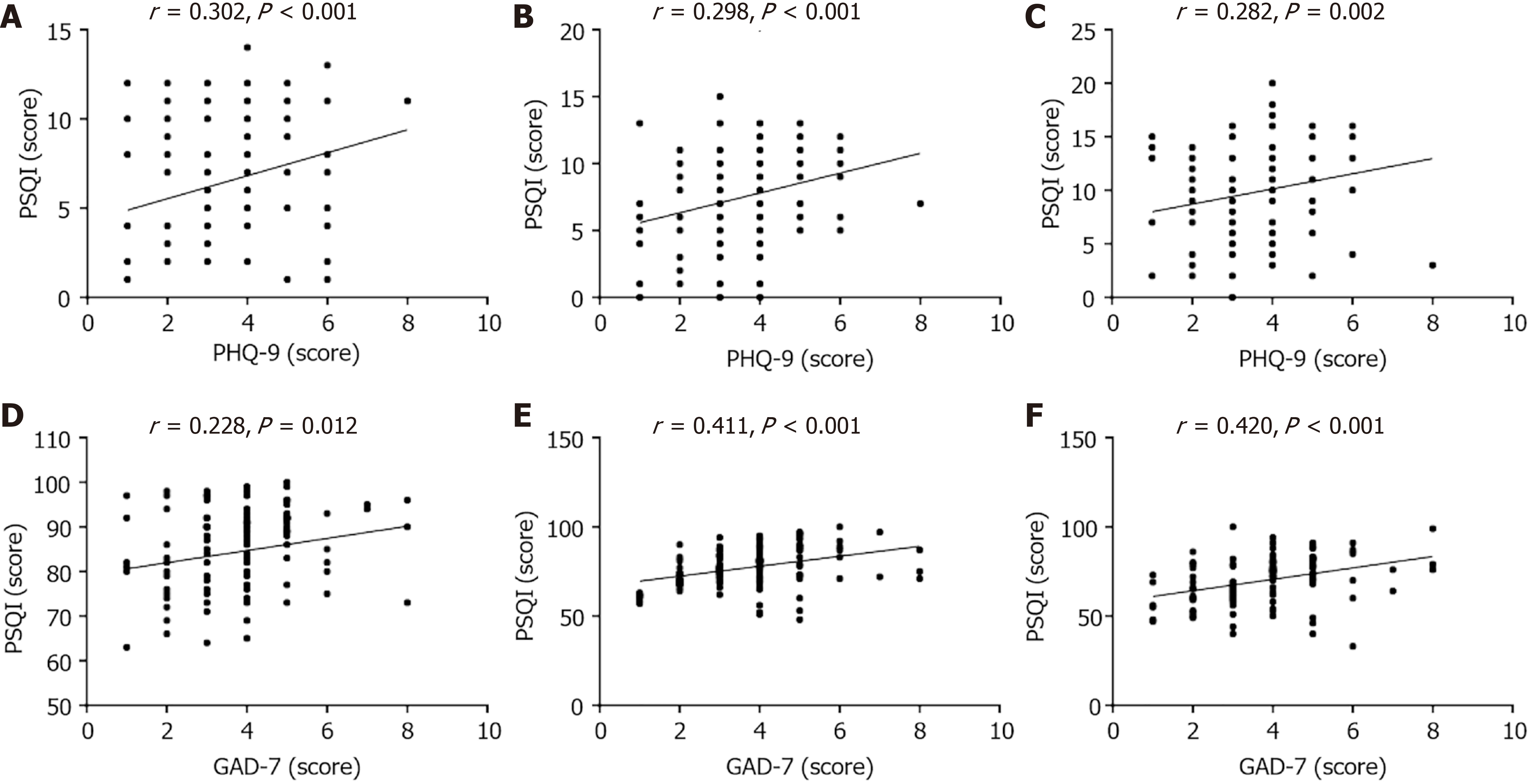 A: Early-pregnancy (12-16 weeks) depression (Patient Health Questionnaire-9) and insomnia [Pittsburgh Sleep Quality Index (PSQI)] correlations; B: Depression-insomnia links at mid-pregnancy (24-28 weeks); C: Late gestation (32-36 weeks) associations between Patient Health Questionnaire-9 and PSQI measures; D: Relationship between Generalized Anxiety Disorder-7 (GAD-7) scores (anxiety) and PSQI at 12-16 weeks among hypertensive disorders in pregnancy-positive women; E: GAD-7 and PSQI associations in the second trimester (24-28 weeks); F: Connection between GAD-7 and PSQI scores at 32-36 weeks in women with hypertensive disorders in pregnancy. GAD-7: Generalized Anxiety Disorder-7; PHQ-9: Patient Health Questionnaire-9; PSQI: Pittsburgh Sleep Quality Index.