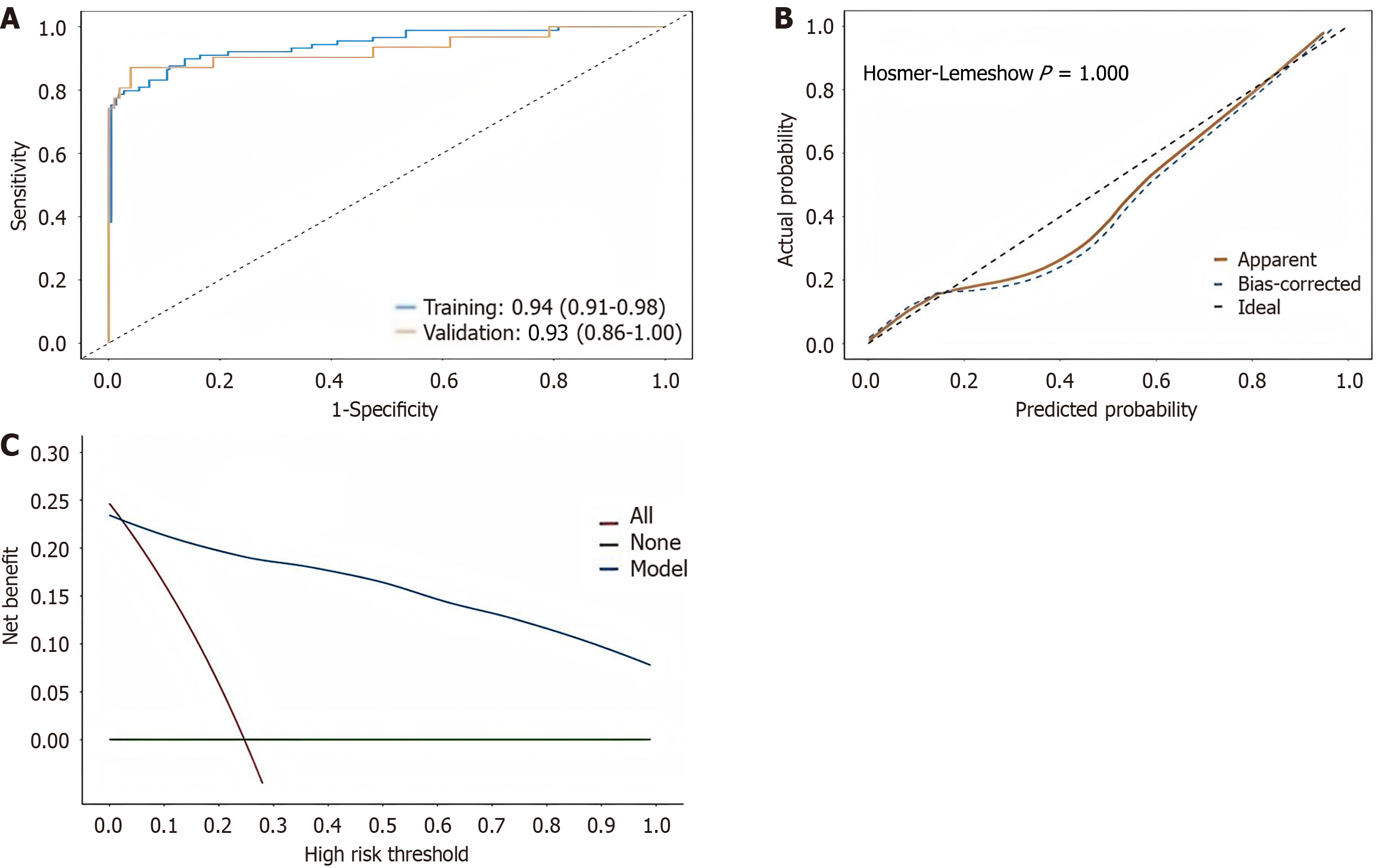 A: Receiver operating characteristic curves of the modeling and verification groups with respect to violent behavior in hospitalized patients with severe mental disorders (SMDs); B: H-L test of the predictive model of violent behavior in hospitalized patients with SMDs; C: Decision curve analysis curve of the prediction model of violent behavior in hospitalized patients with SMDs.