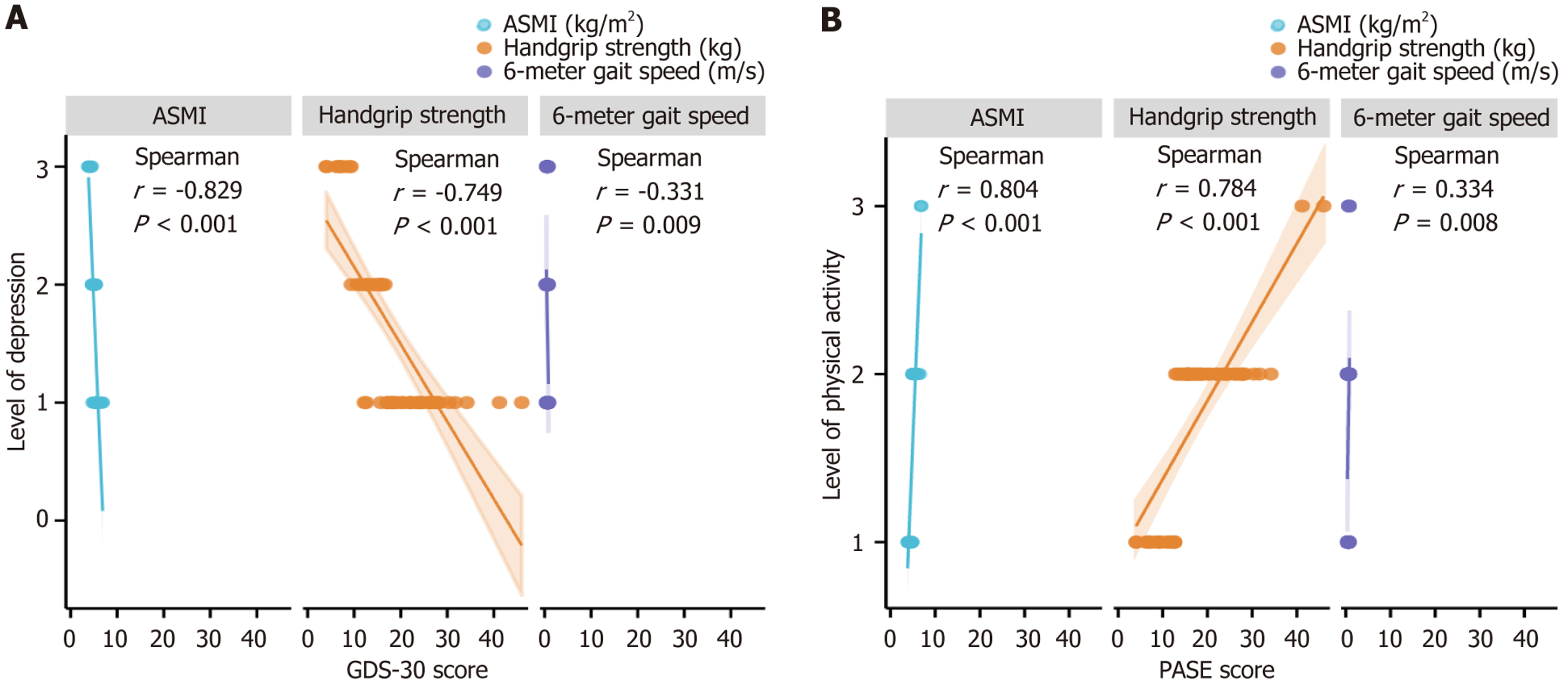 A: Sarcopenia and depression; B: Sarcopenia and physical activity level. ASMI: Appendicular skeletal muscle mass index; GDS-30: 30-item Geriatric Depression Scale; PASE: Physical Activity Scale for the Elderly.