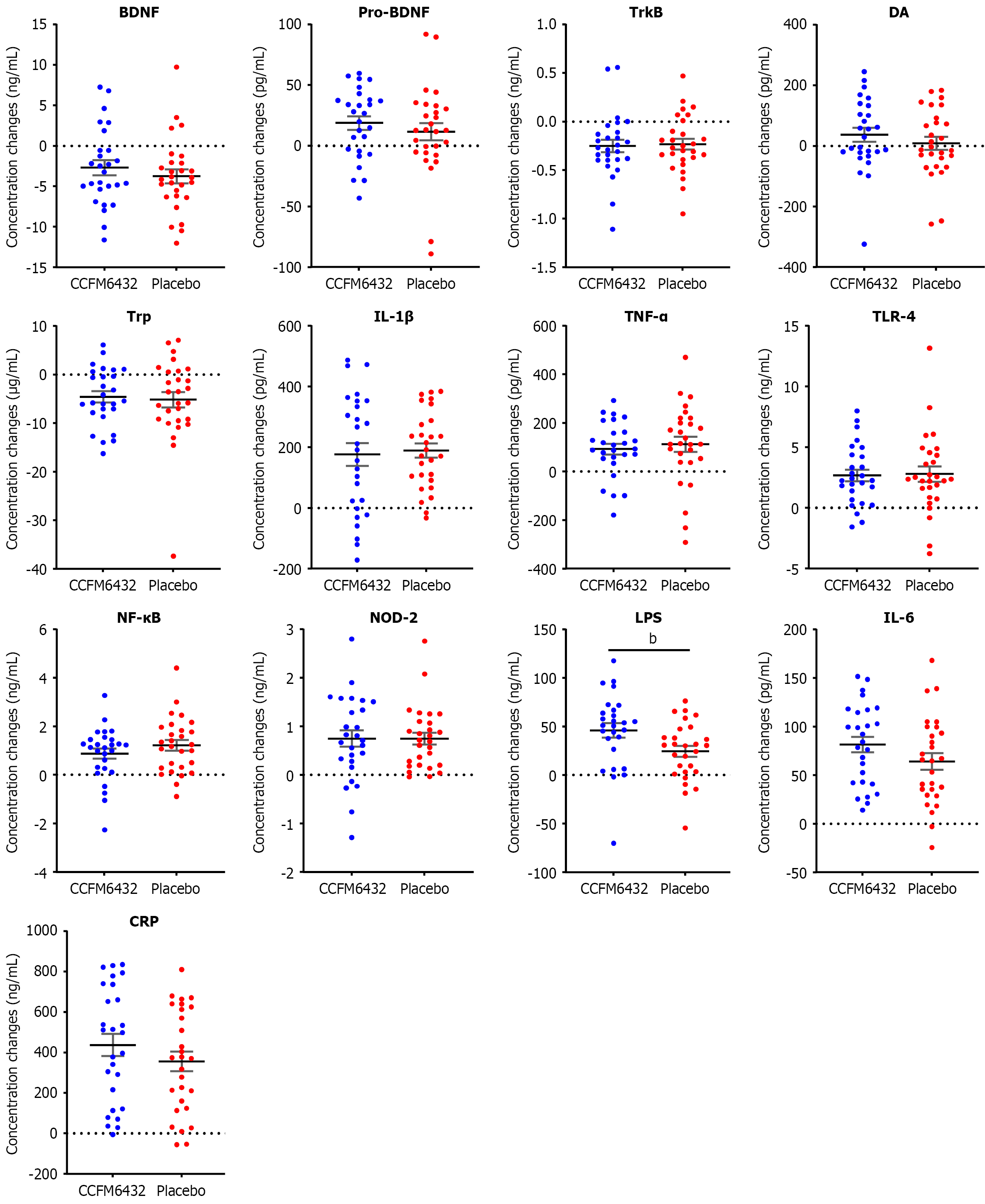 This figure summarizes concentration changes in blood biomarker levels between the two groups. bP < 0.05 indicates a significant between-group difference (independent-samples t-test). Concentration change = baseline value - follow-up value. BDNF: Brain-derived neurotrophic factor; Pro-BDNF: Pro-brain-derived neurotrophic factor; TrkB: Tropomyosin-related kinase B; DA: Dopamine; Trp: Tryptophan; IL-1β: Interleukin-1 beta; TNF-α: Tumor necrosis factor-alpha; TLR-4: Toll-like receptor 4; NF-κB: Nuclear factor kappa B; NOD-2: Nucleotide-binding oligomerization domain-containing protein 2; LPS: Lipopolysaccharide; CRP: C-reactive protein; IL-6: Interleukin-6.