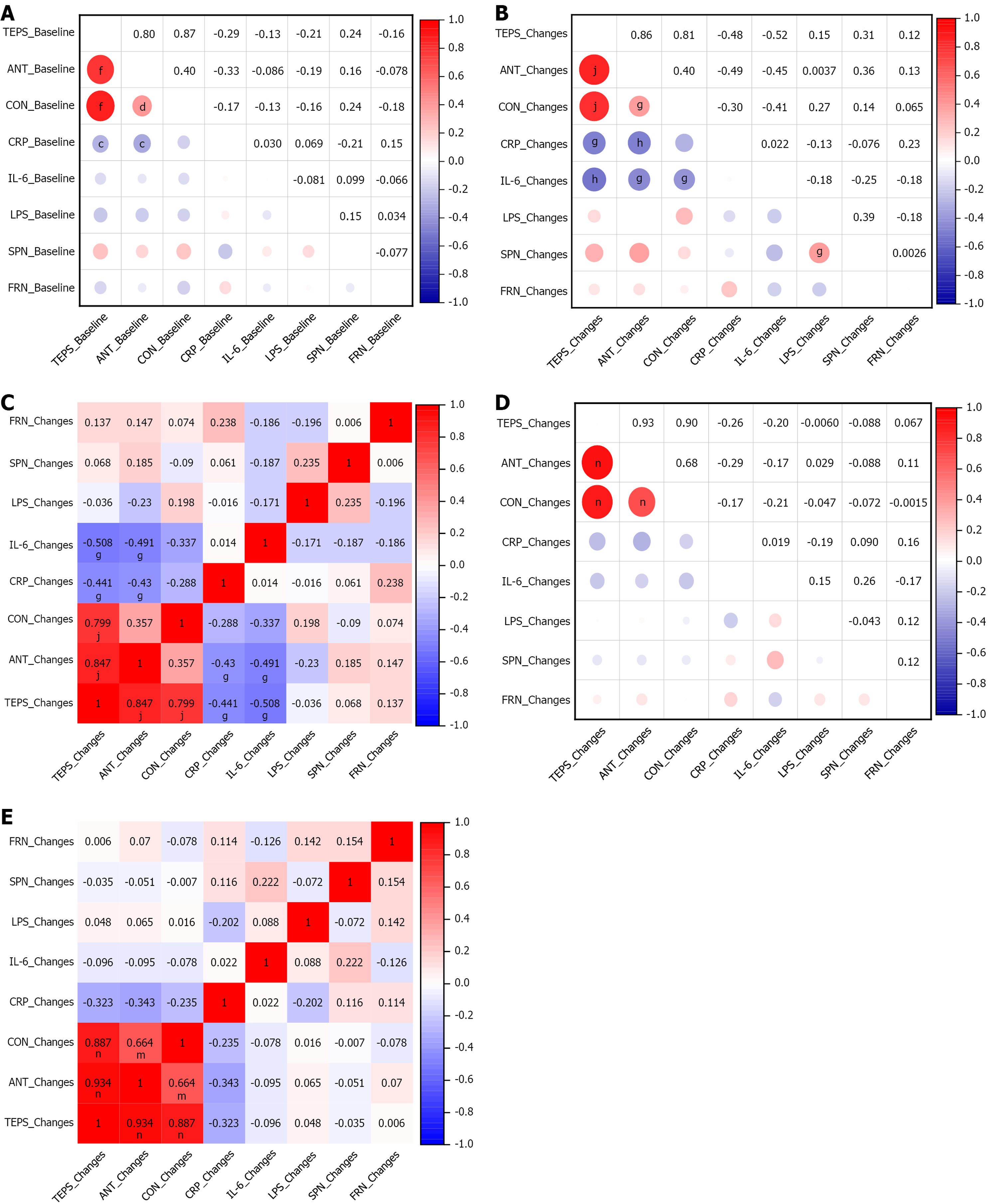 This figure summarizes the Pearson and partial correlation analyses conducted on baseline variables and change values in both the CCFM6432 and placebo groups. Change value = baseline value - follow-up value. A: Pearson correlation analysis of baseline variables in the two groups. cP < 0.05; dP < 0.01; eP < 0.001; fP < 0.0001; B: Pearson correlation analysis of change values in the CCFM6432 group. gP < 0.05; hP < 0.01; iP < 0.001; jP < 0.0001; C: Partial correlation analysis of change values in the CCFM6432 group controlling for changes in Hamilton Anxiety Rating Scale and Hamilton Depression Rating Scale. gP < 0.05; hP < 0.01; iP < 0.001; jP < 0.0001; D: Pearson correlation analysis of change values in the placebo group. kP < 0.05; lP < 0.01; mP < 0.001; nP < 0.0001; E: Partial correlation analysis of change values in the placebo group controlling for changes in Hamilton Anxiety Rating Scale and Hamilton Depression Rating Scale. kP < 0.05; lP < 0.01; mP < 0.001; nP < 0.0001. TEPS: Temporal Experience of Pleasure Scale; ANT: Anticipatory; CON: Consummatory; CRP: C-reactive protein; IL-6: Interleukin-6; LPS: Lipopolysaccharide; SPN: Stimulus-preceding negativity; FRN: Feedback-related negativity.