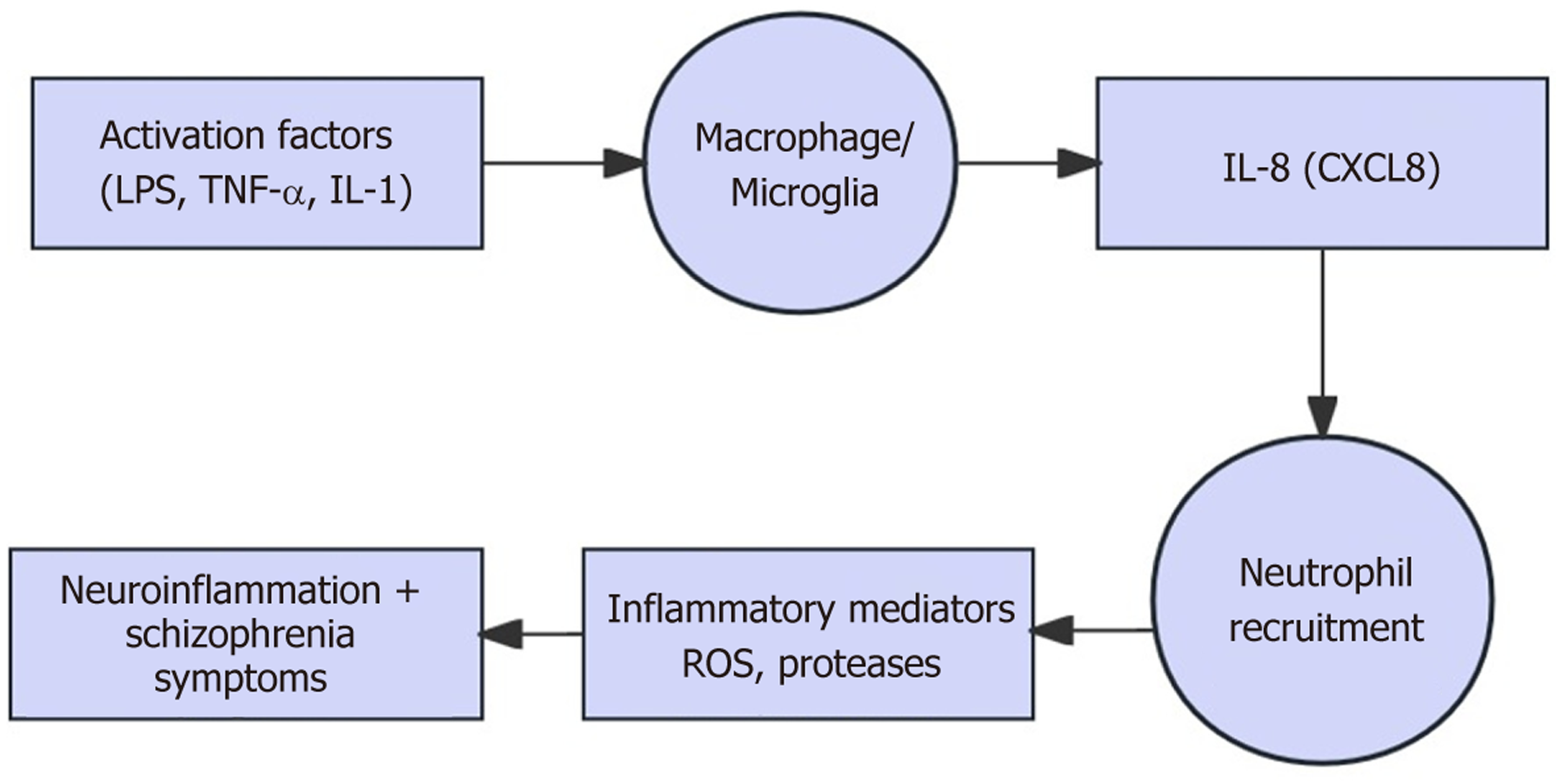 This diagram illustrates the inflammatory mech anism of interleukin (IL)-8 in schizophrenia pathophysiology. Activation factors (lipopolysaccharide, tumor necrosis factor-alpha, IL-1) stimulate macrophages and microglia to produce IL-8 [chemokine (C-X-C motif) ligand 8], which recruits neutrophils to inflammatory sites. These activated neutrophils release inflammatory mediators including reactive oxygen species and proteases, contributing to neuroinflammation and schizophrenia symptoms. This pathway highlights the role of IL-8 as a key chemokine linking innate immune responses to neuropsychiatric manifestations in schizophrenia. CXCL8: Chemokine (C-X-C motif) ligand 8; IL: Interleukin-8; LPS: Lipopolysaccharide; ROS: Reactive oxygen species; TNF-α: Tumor necrosis factor-alpha.