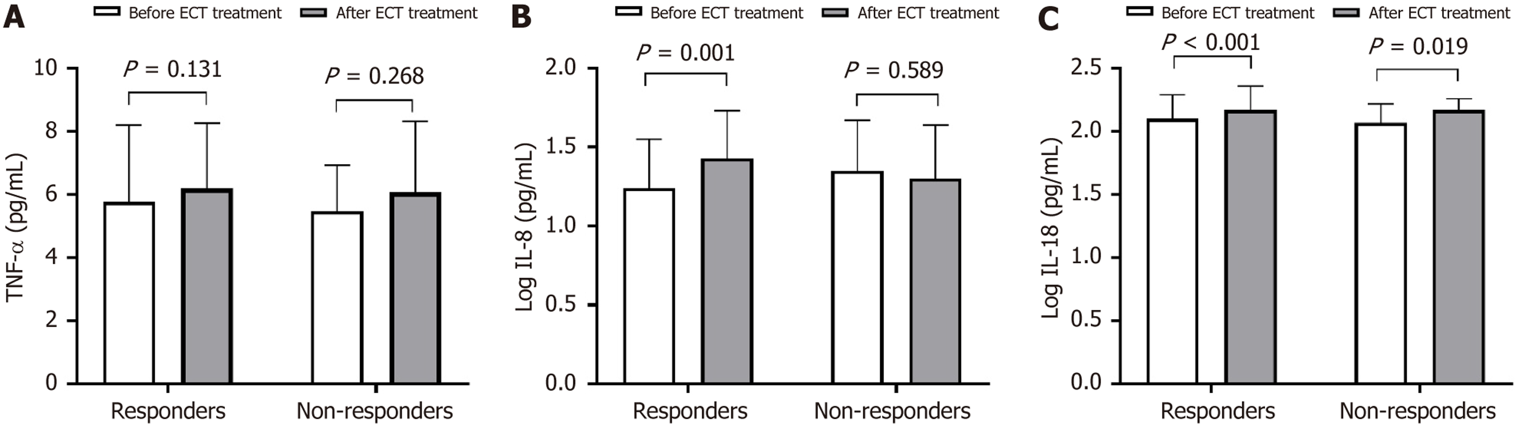 A: Tumor necrosis factor-alpha levels; B: Interleukin-8 levels (log-transformed); C: Interleukin-18 levels (log-transformed). They were compared between responders and non-responders before (white bars) and after (gray bars) electroconvulsive therapy treatment. ECT: Electroconvulsive therapy; IL: Interleukin-8; TNF-α: Tumor necrosis factor-alpha.