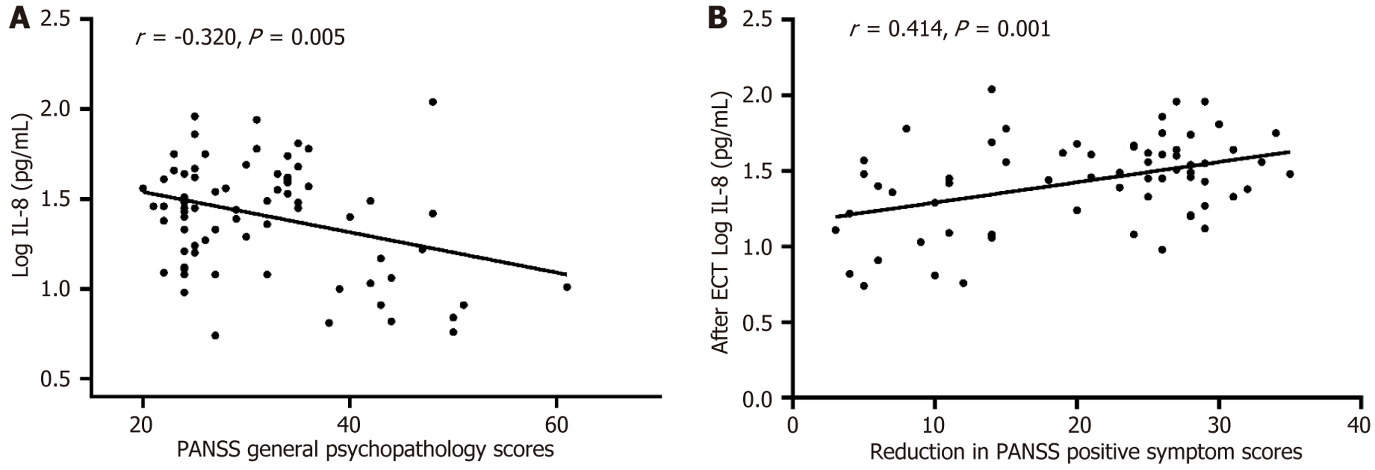 A: Correlation between the serum inter leukin-8 concentration and Positive and Negative Syndrome Scale general psychopathology subscale score after electroconvulsive therapy treatment; B: Correlation between the serum interleukin-8 concentration and reduction in the Positive and Negative Syndrome Scale positive symptom subscale score after electroconvulsive therapy in the responder group. ECT: Electroconvulsive therapy; IL: Interleukin-8; PANSS: Positive and Negative Syndrome Scale.