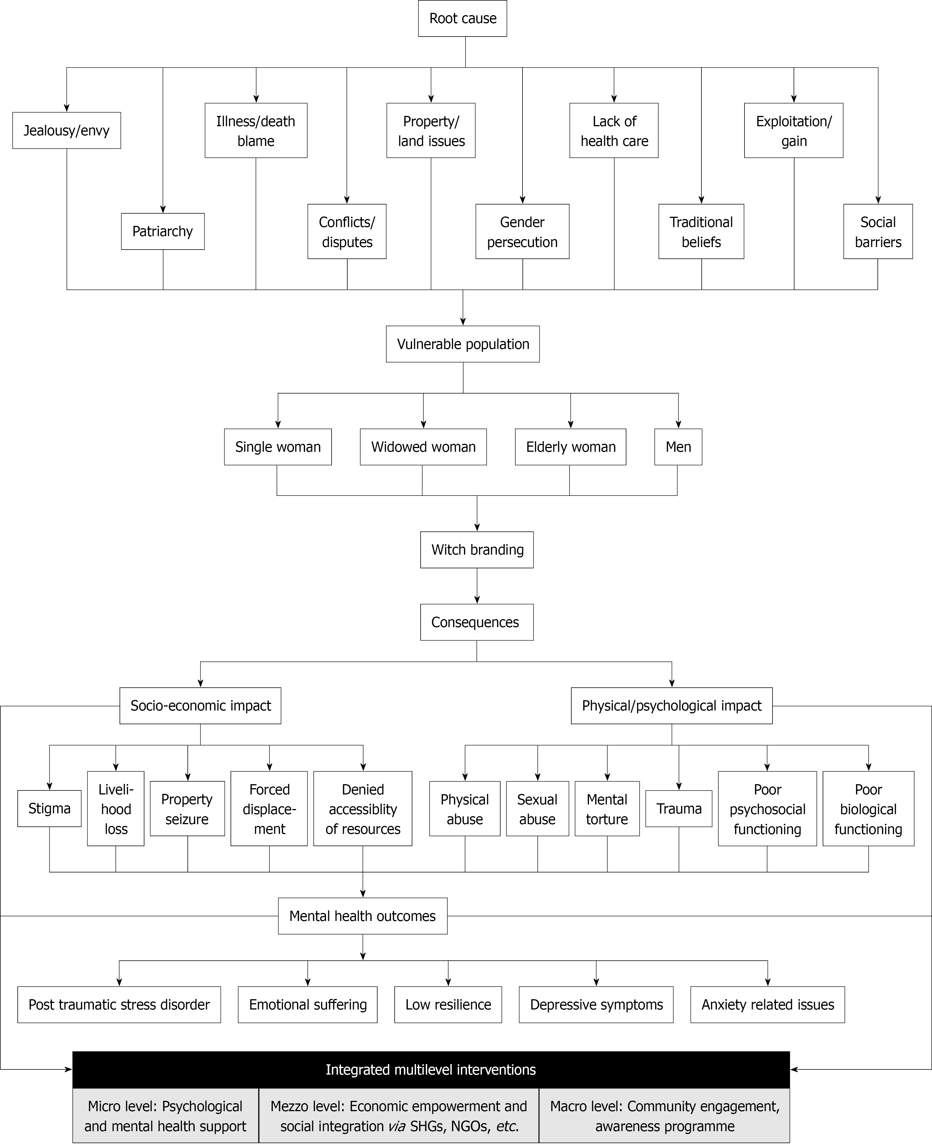 Figure 2 A conceptual framework of the witch-branding process: Root causes, victim vulnerability, impact, and multilevel intervention strategies.