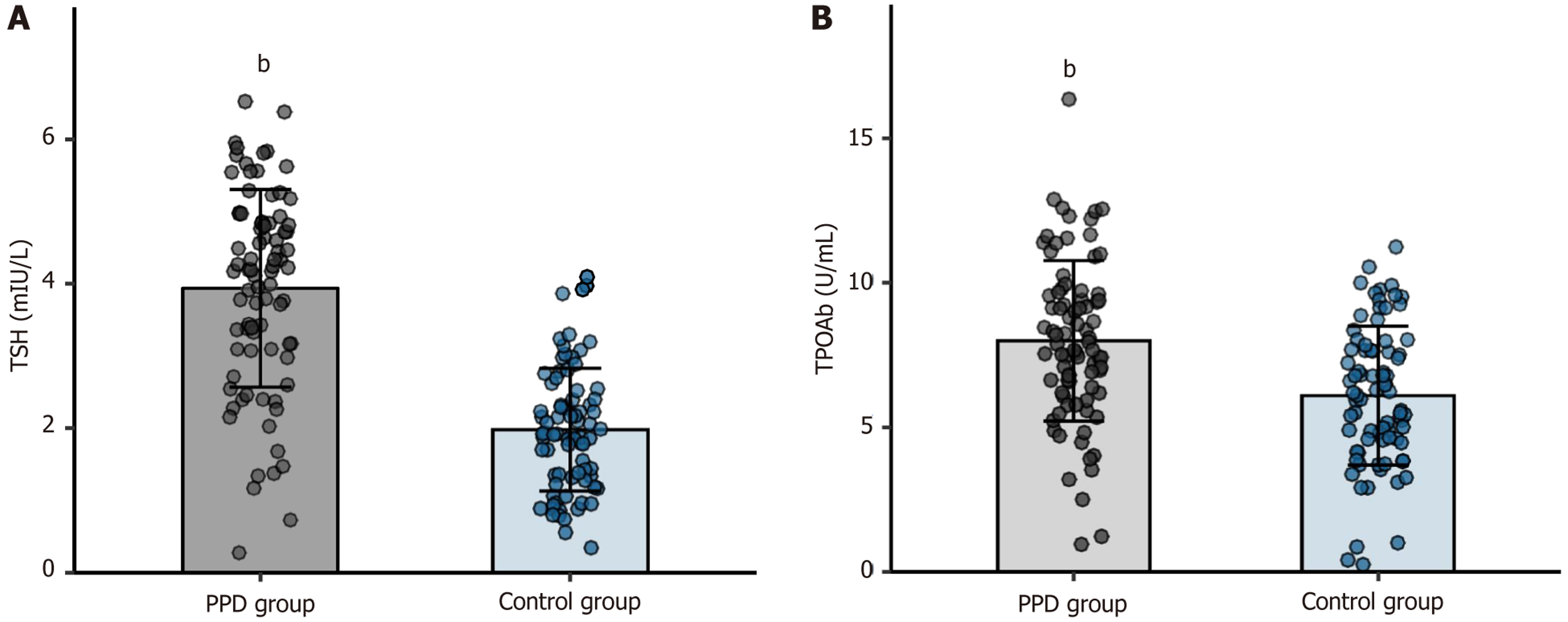 A: Serum thyroid-stimulating hormone concentrations in postpartum depression groups vs controls; B: Serum thyroid peroxidase antibody levels in postpartum depression cases vs controls. bP < 0.01, vs controls. TSH: Thyroid-stimulating hormone; PPD: Postpartum depression; TPOAb: Thyroid peroxidase antibody.