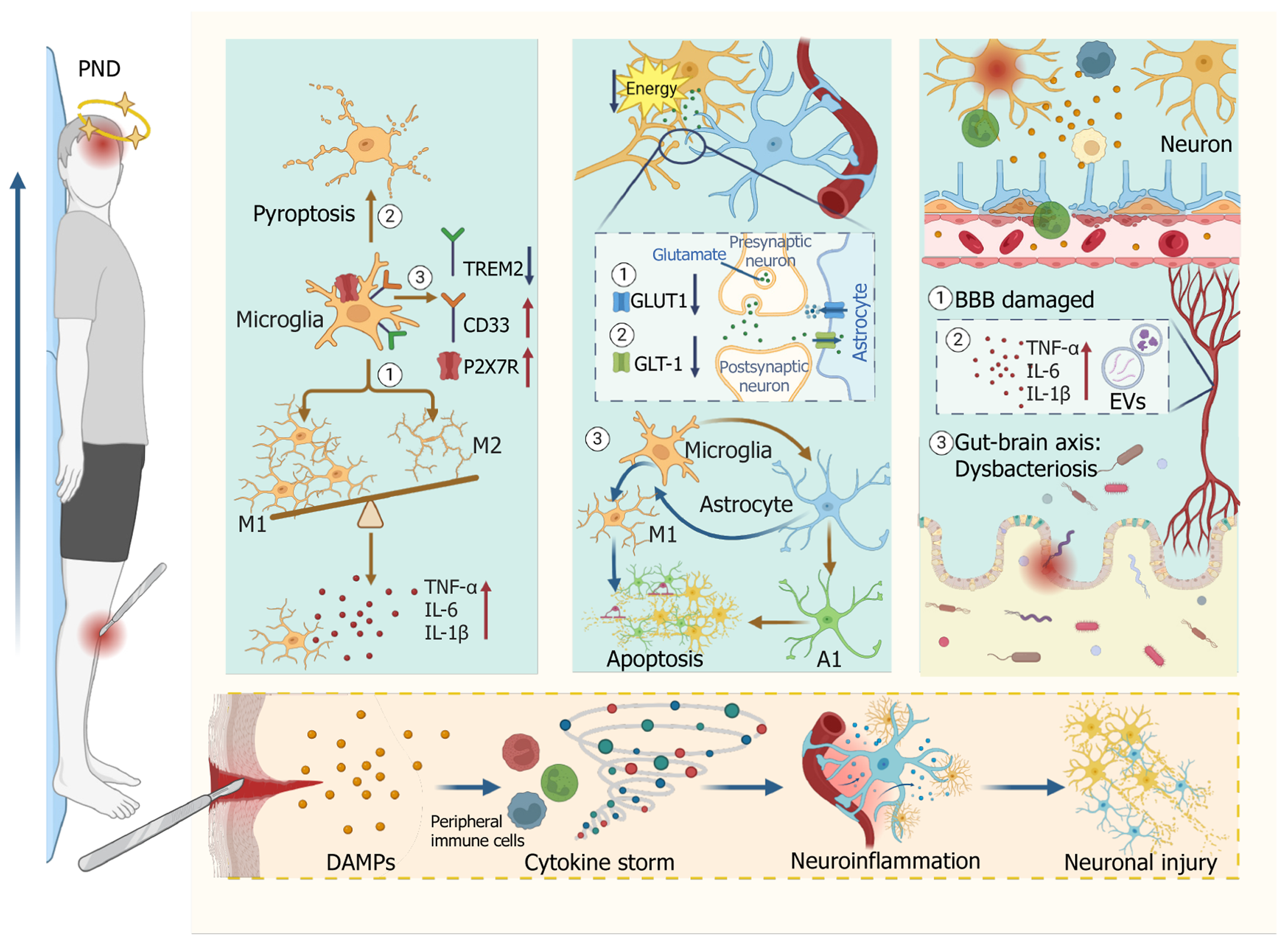 Perioperative factors such as surgery and anesthesia activate the peripheral immune system, triggering the release of damage-associated molecular patterns and a subsequent cytokine surge. These inflammatory signals reach the central nervous system through multiple routes, including disruption of the blood-brain barrier and dysregulation of the gut-brain axis, ultimately resulting in neuronal injury. Within the central nervous system, microglia become activated and polarize toward a pro-inflammatory M1 phenotype, releasing inflammatory mediators and undergoing pyroptosis. Key regulatory molecules such as triggering receptor expressed on myeloid cells 2, CD33, and P2X7 receptor, which modulate microglial activity, display abnormal expression and further amplify neuroinflammation. At the same time, astrocytic dysfunction occurs. This includes reduced expression of the glucose transporter 1 transporter on the cell membrane and abnormal expression of neurotransmitter-regulating transporters such as glutamate transporter 1. These changes disrupt energy metabolism and impair neurotransmitter homeostasis. In addition, harmful interactions between microglia and astrocytes continually intensify the neuroinflammatory cascade. Other mechanisms, including blood-brain barrier impairment, disturbances of the gut-brain axis, extracellular vesicle trafficking, and excessive release of pro-inflammatory cytokines, also contribute to the pathogenesis of postoperative neurocognitive disorders. Together, these processes lead to synaptic dysfunction and neuronal injury, which ultimately result in cognitive decline and the clinical onset of postoperative neurocognitive disorders. PND: Postoperative neurocognitive disorders; M1: Pro-inflammatory microglial phenotype; M2: Anti-inflammatory microglial phenotype; TREM2: Triggering receptor expressed on myeloid cells 2; P2X7R: P2X7 receptor; TNF-α: Tumor necrosis factor-α; IL: Interleukin; GLUT1: Glucose transporter 1; GLT-1: Glutamate transporter 1; A1: Neurotoxic reactive astrocyte phenotype; BBB: Blood-brain barrier; EVs: Extracellular vesicles; DAMPs: Damage-associated molecular patterns.