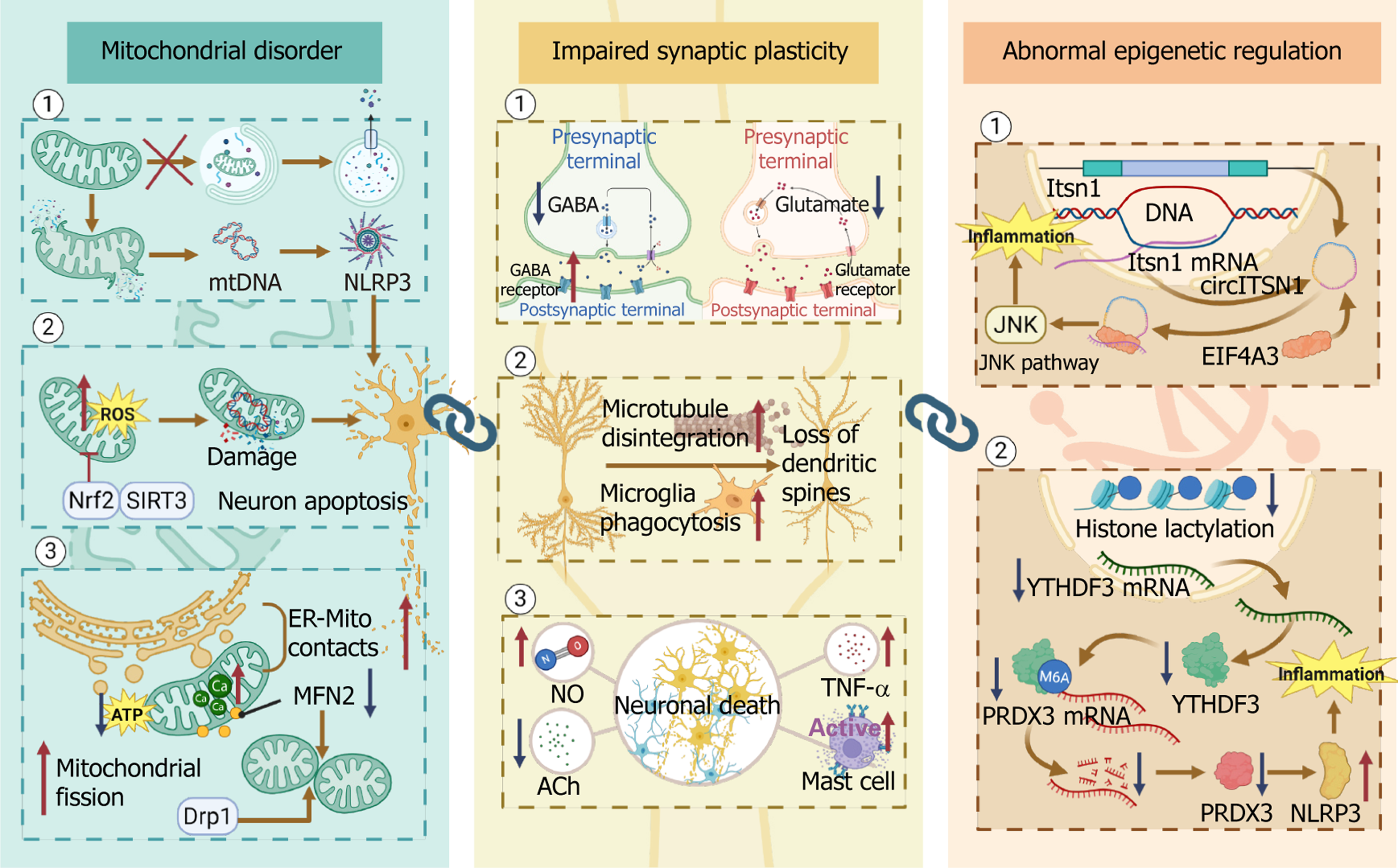 Figure 2 Three core pathological links of postoperative neurocognitive disorders: Mitochondrial dysfunction, impaired synaptic plasticity and abnormal epigenetic regulation.