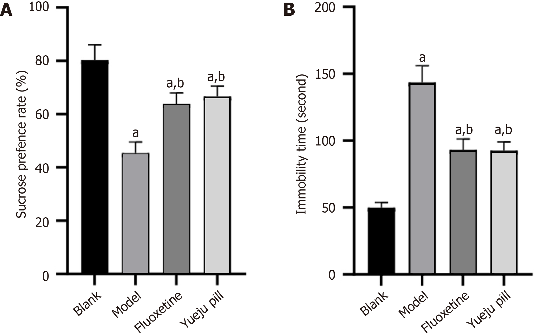 A: Sucrose preference rates across groups; B: Immobility time in each group. aP < 0.05 vs blank group; bP < 0.05 vs model group.