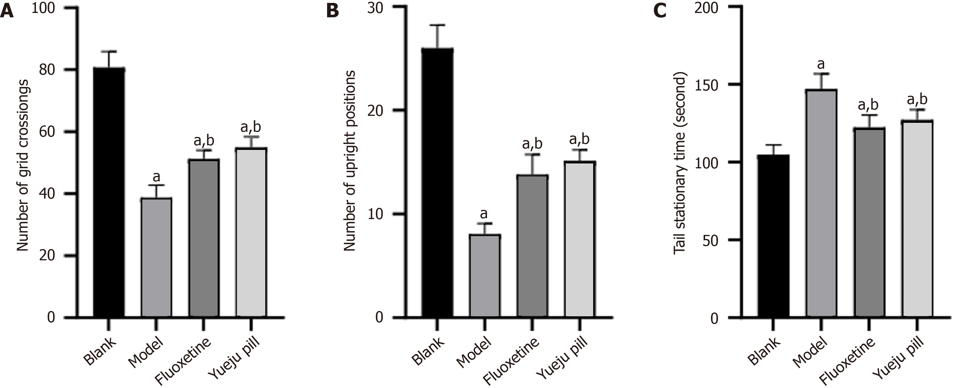 A: Comparison of the number grid crossings; B: Rearing frequency comparison; C: Comparison of tail stationary time. aP < 0.05 vs blank group; bP < 0.05 vs model group.