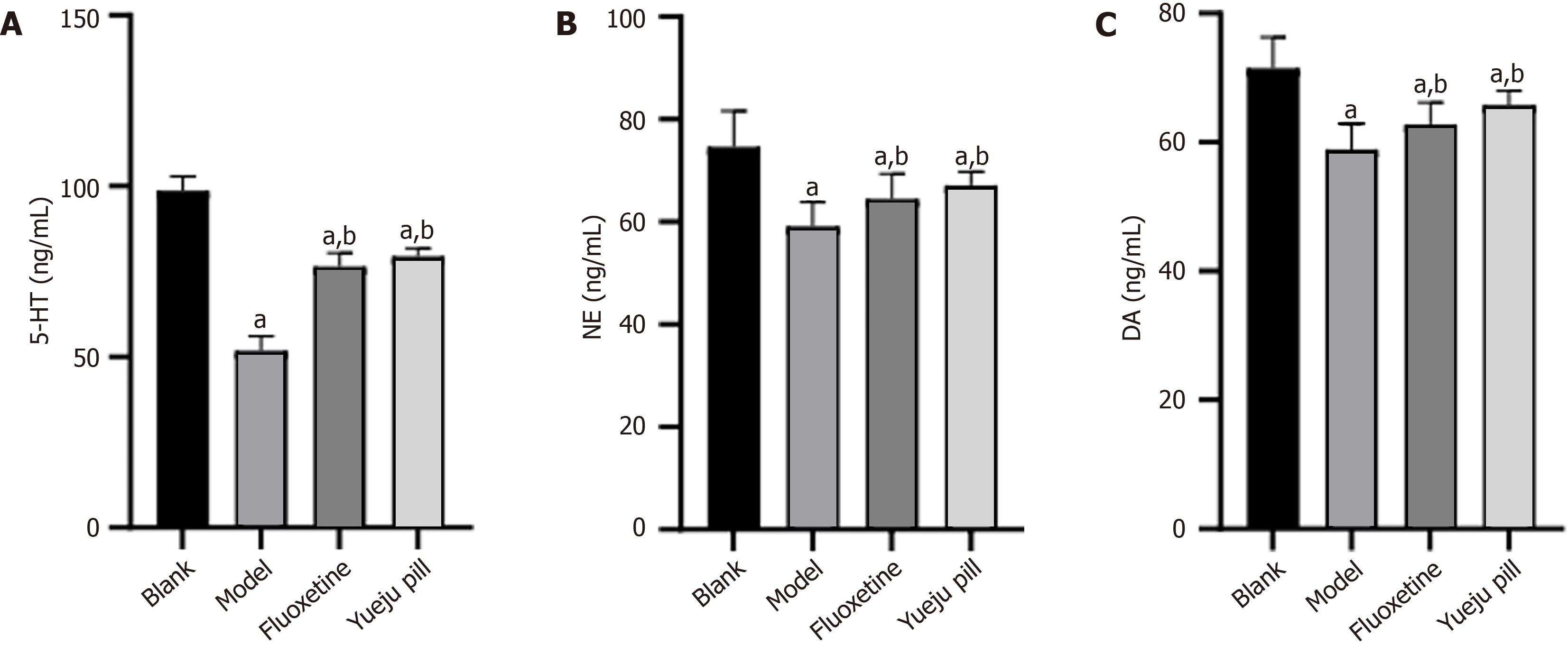 A: Serum 5-hydroxytryptamine comparison across groups; B: Serum norepinephrine comparison; C: Serum dopamine comparison. aP < 0.05 vs blank group; bP < 0.05 vs model group. 5-HT: 5-hydroxytryptamine; NE: Norepinephrine; DA: Dopamine.