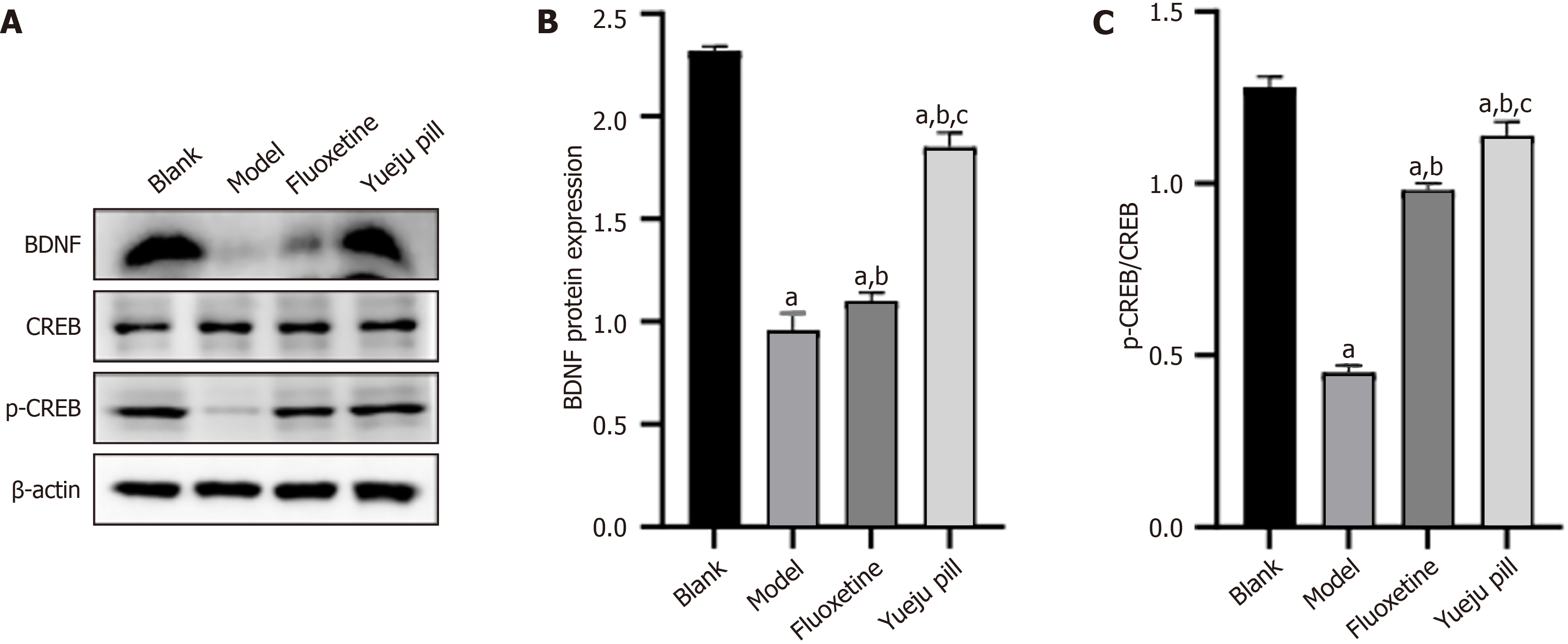 A: Brain-derived neurotrophic factor (BDNF)/cAMP response element-binding protein (CREB) axis-associated protein bands across groups; B: BDNF protein expression; C: CREB protein expression. aP < 0.05 vs blank group; bP < 0.05 vs model group; cP < 0.05 vs fluoxetine group. BDNF: Brain-derived neurotrophic factor; CREB: CAMP response element-binding protein.
