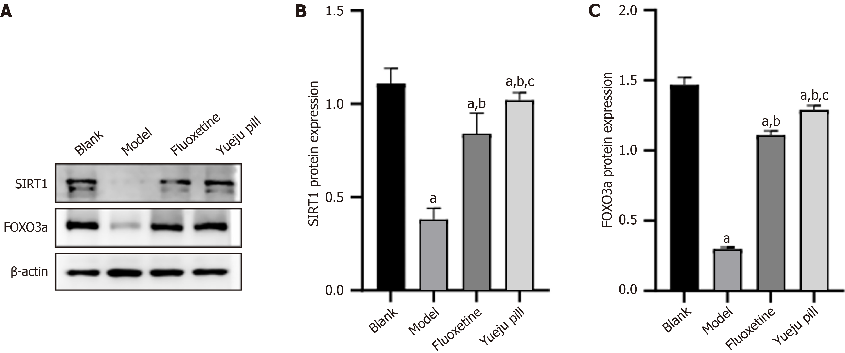 A: SIRT1/FOXO3a axis-related protein bands across groups; B: SIRT1 protein expression; C: FOXO3a protein expression. aP < 0.05 vs blank group; bP < 0.05 vs model group; cP < 0.05 vs fluoxetine group.