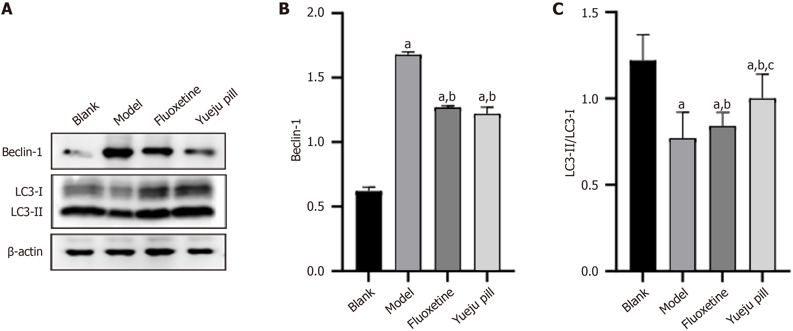 A: Autophagy-related protein bands across group; B: Beclin-1 protein expression; C: LC3 protein expression. aP < 0.05 vs blank group; bP < 0.05 vs model group; cP < 0.05 vs fluoxetine group.
