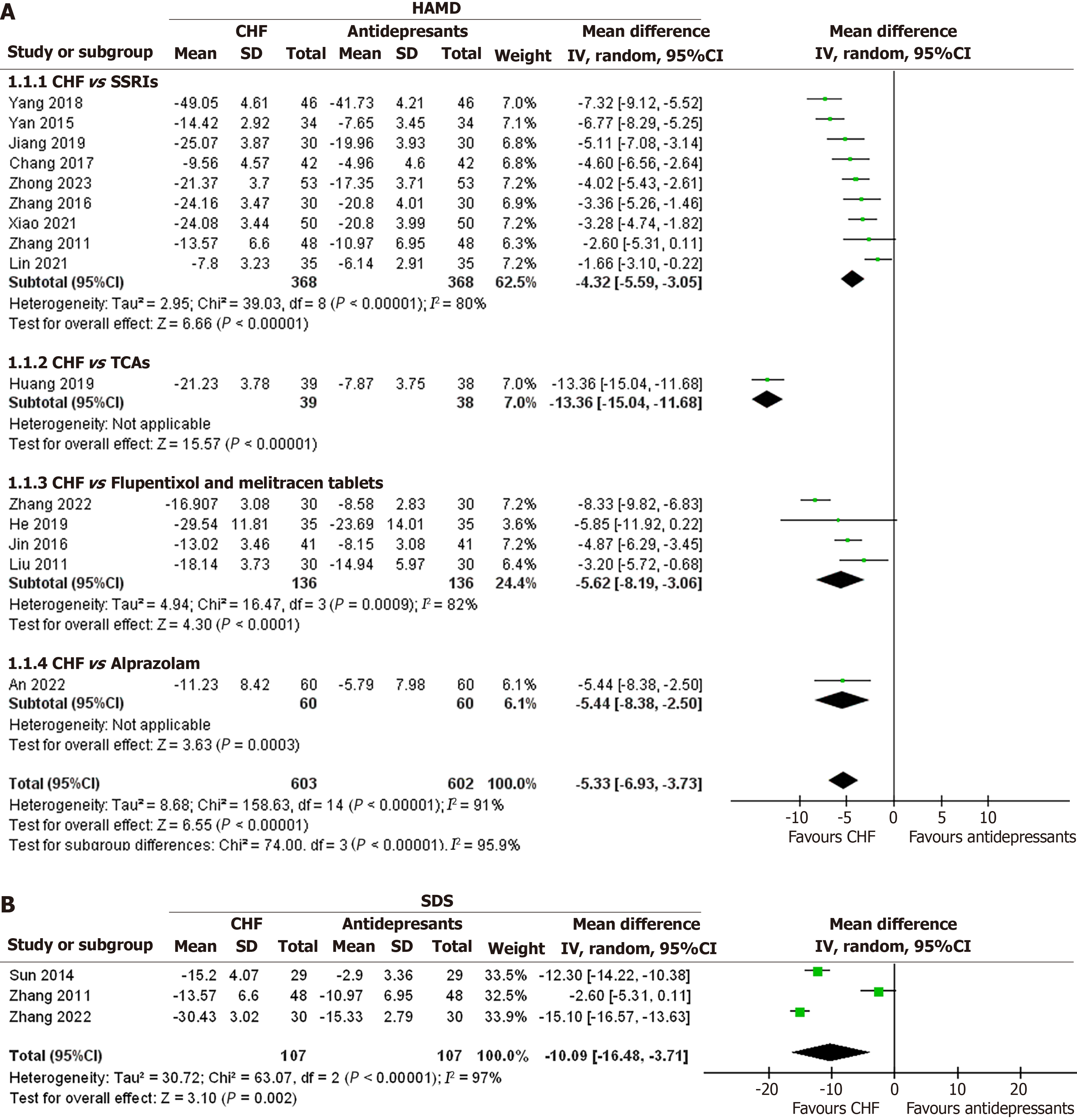 A: Forest plot of Hamilton Depression Rating Scale; B: Forest plot of Self-rating Depression Scale. HAMD: Hamilton Depression Rating Scale; CHF: Chinese herbal formula; CI: Confidence interval; SDS: Self-rating Depression Scale.