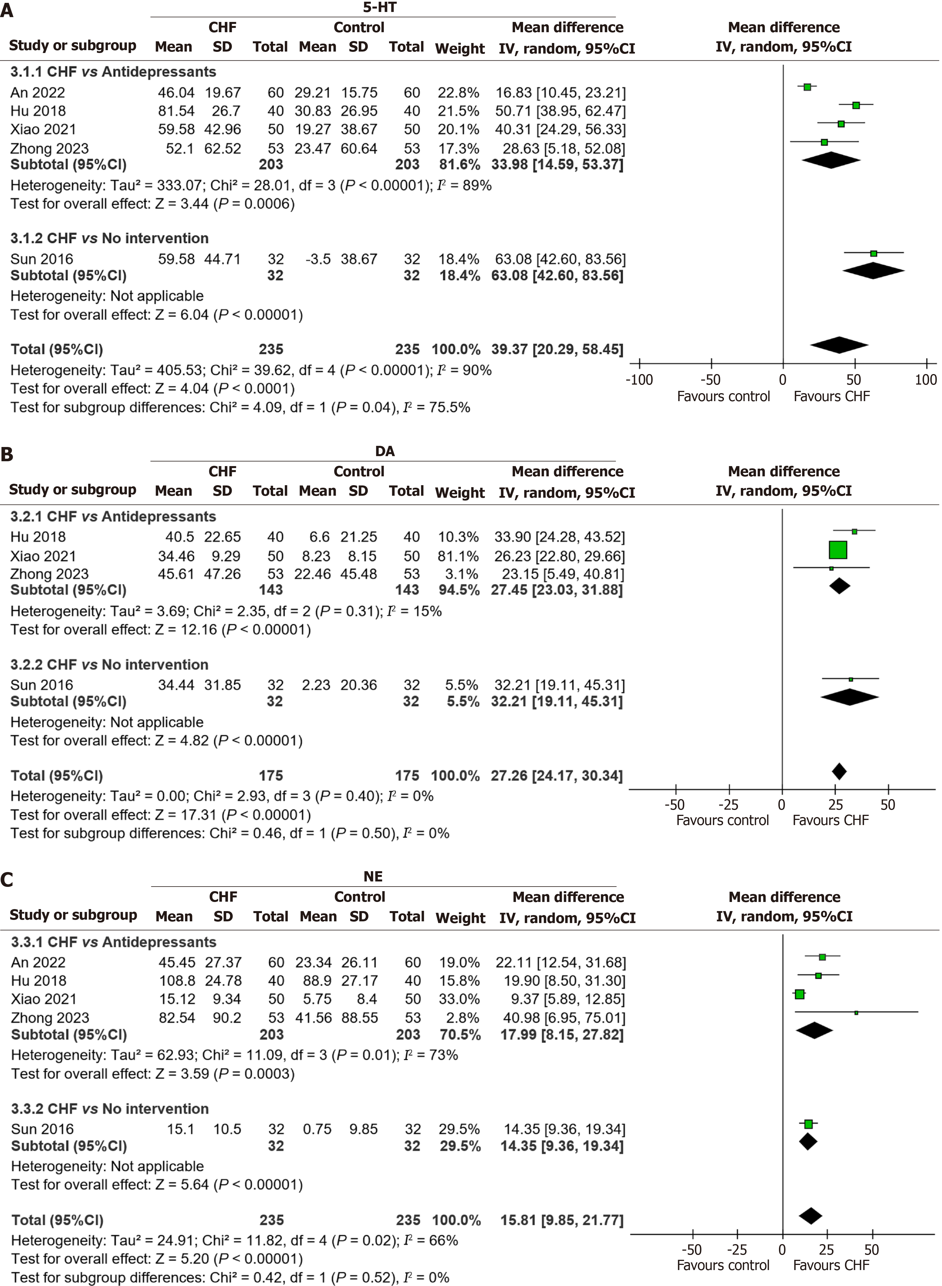 A: Forest plot of 5-hydroxytryptamine; B: Forest plot of dopamine; C: Forest plot of norepinephrine. CHF: Chinese herbal formula; CI: Confidence interval; 5-HT: 5-hydroxytryptamine; DA: Dopamine; NE: Norepinephrine.