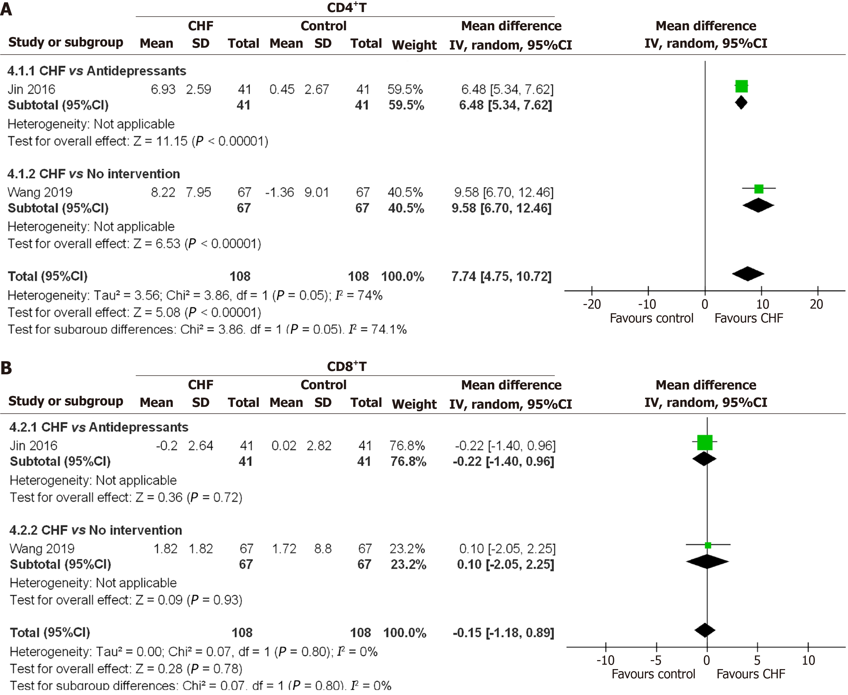 A: Forest plot of CD4+; B: Forest plot of CD8+. CHF: Chinese herbal formula; CI: Confidence interval.