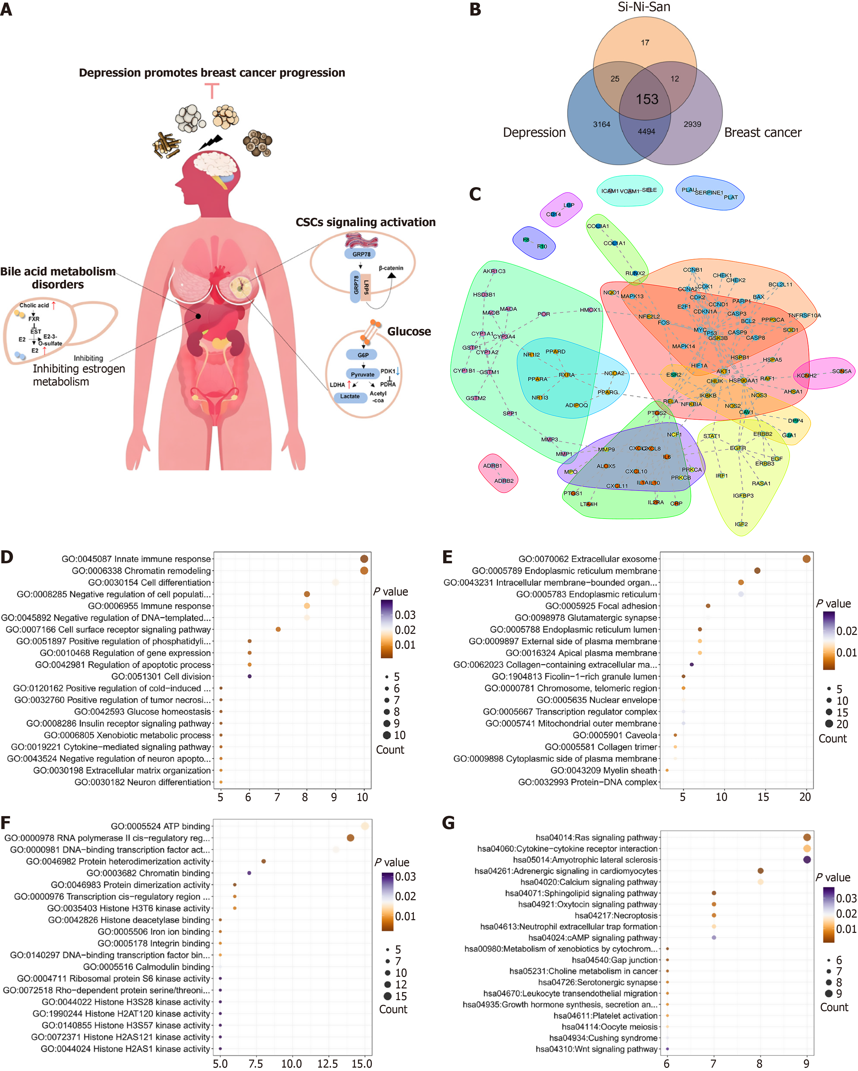 A: Preclinical evidence of Si-Ni-San in suppressing breast tumor growth and metastasis induced by chronic psychological stress; B: The intersection of target genes involved in top five herbs, breast cancer and depression; C: Protein-protein-interaction network analysis of the common target genes; D: Biological process enrichment analysis of the common target genes; E: Molecular function enrichment analysis of the common target genes; F: Cellular component enrichment analysis of the common target genes; G: Kyoto Encyclopedia of Genes and Genomes enrichment analysis of the common target genes. CSCs: Cancer stem cells.