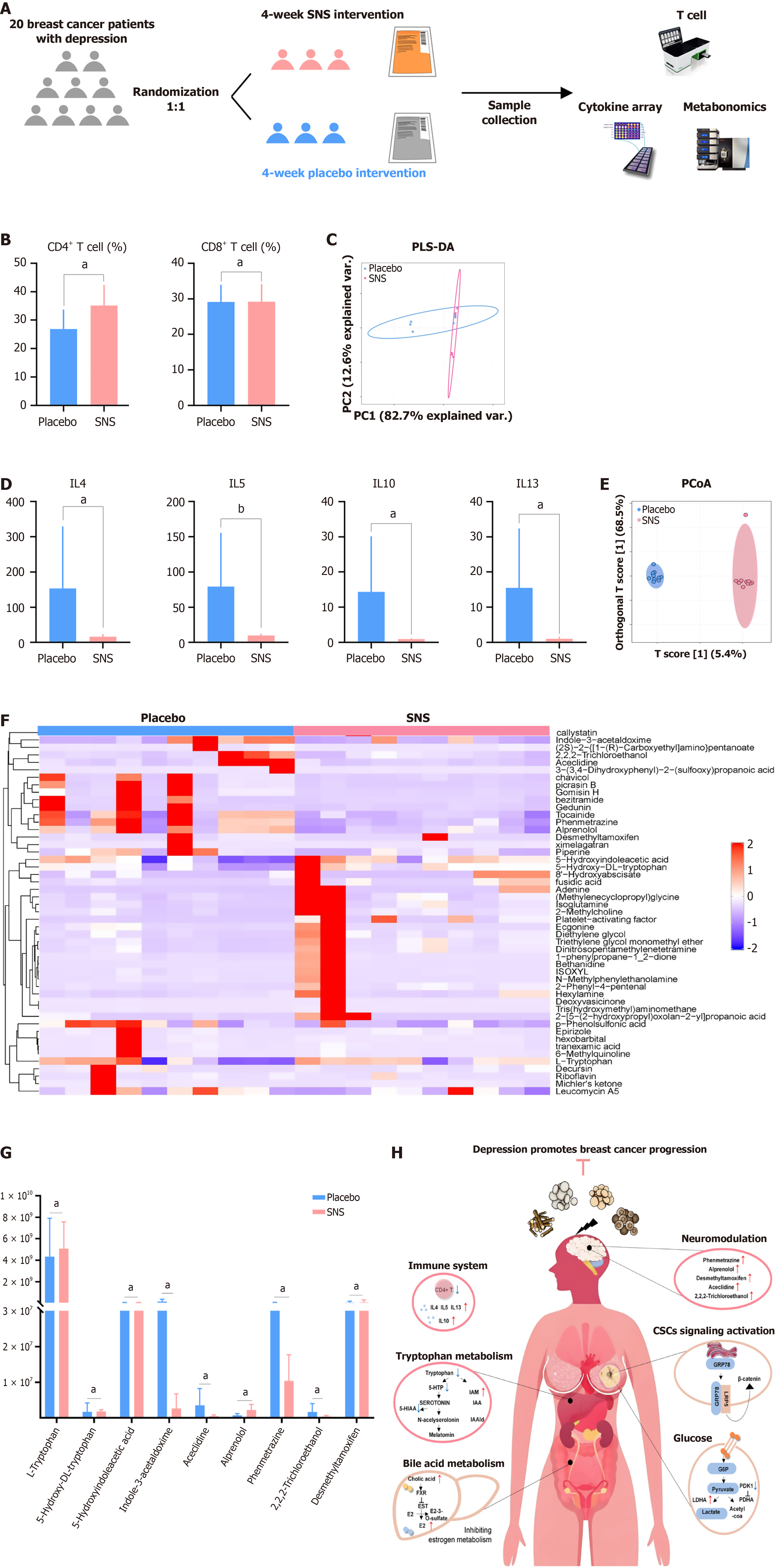 A: Experimental design schematic comparing the Si-Ni-San treatment group to the placebo control group; B: Alterations in the frequencies of CD4+ and CD8+ T cell populations between groups (n = 10); C: Partial least squares-discriminant analysis of serum cytokine profiles between groups (n = 10 per group); D: Expression levels of key cytokines derived from CD4+ T cells between groups; E: Principal coordinates analysis of serum metabolomic profiles between groups (n = 10 per group); F: Heatmap of serum metabolomic between groups; G: Differential abundance of metabolites between groups; H: Summary of antidepressant mechanisms of Si-Ni-San. SNS: Si-Ni-San; PLS-DA: Partial least squares-discriminant analysis; IL: Interleukin; PCoA: Principal coordinates analysis; CSCs: Cancer stem cells; 5-HTTP: 5-hydroxy-DL-tryptophan; 5-HIAA: 5-hydroxyindoleacetic acid; IAM: Indole-3-acetaldoxime. aP < 0.05, bP < 0.01.