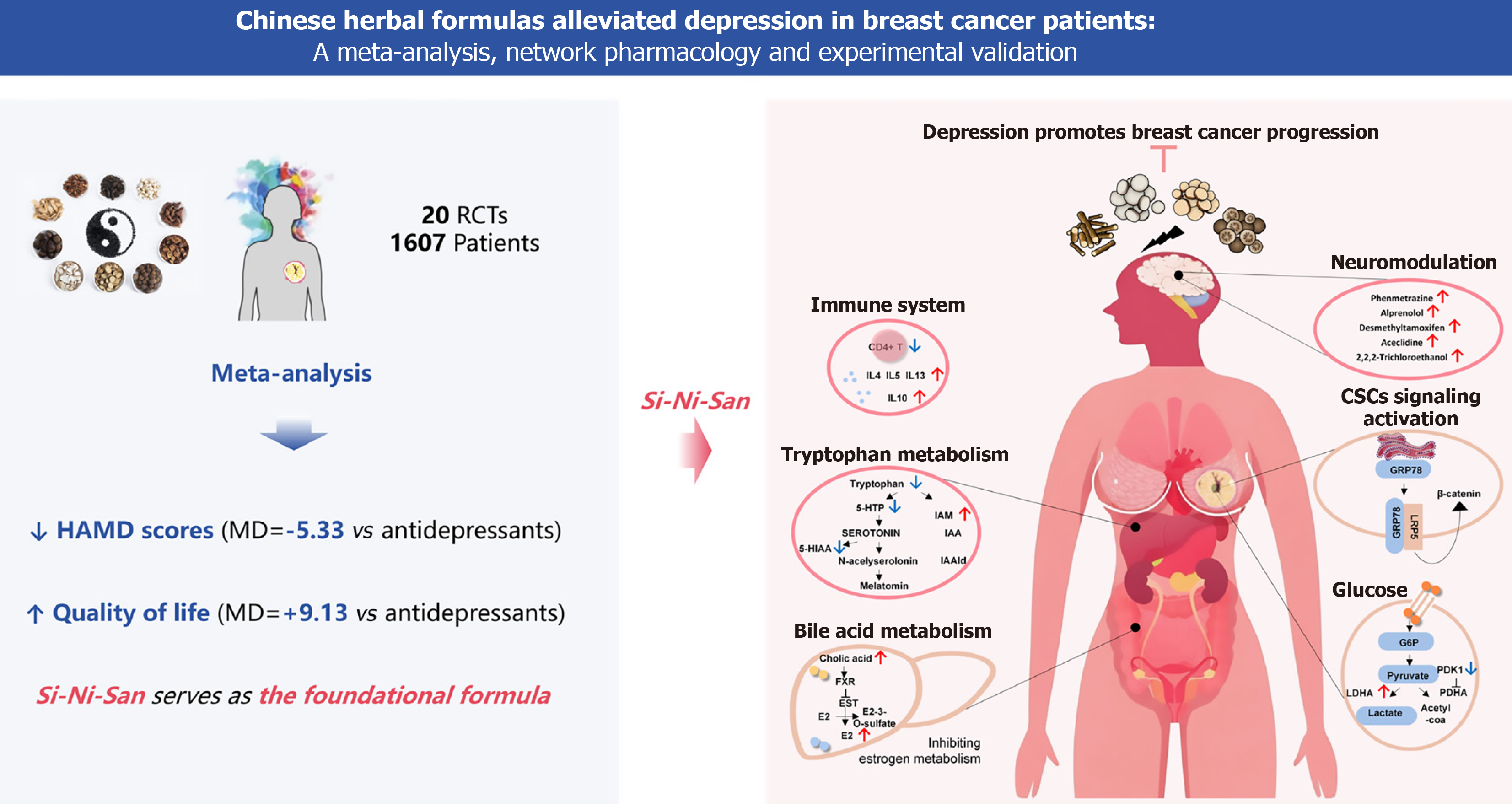 - Citation: Hong SC, Du YY, Wang GB, Wang SQ, Zheng YF, Wang N, Situ HL, Wang ZY. Chinese herbal formulas alleviated depression in breast cancer patients: A meta-analysis, network pharmacology and experimental validation. World J Psychiatry 2026; 16(4): 115981