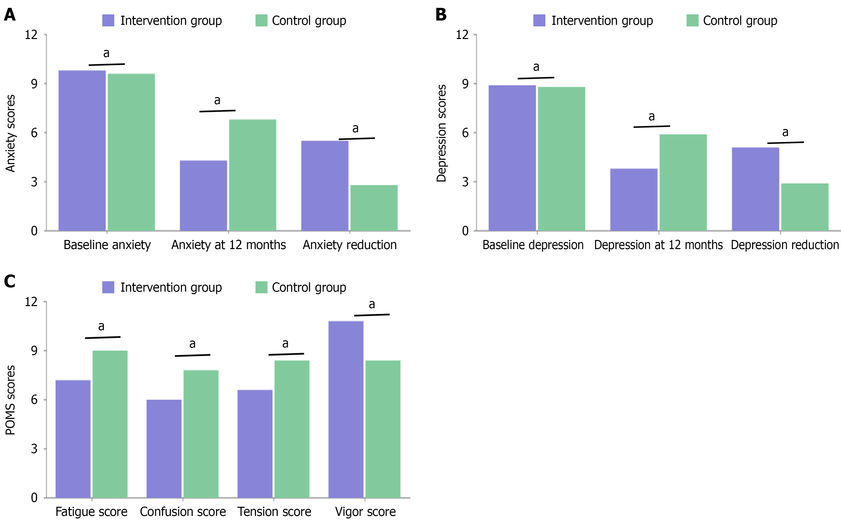 Mean PSS-10 score at 12 months | 12.6 ± 3.8 | 18.4 ± 4.5 | < 0.001 |