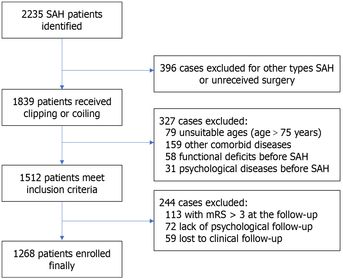 Subarachnoid hemorrhage (SAH), a critical manifestation of hemorrhagic cerebrovascular pathology, is frequently associated with substantial morbidity and a markedly elevated risk of mortality[1]. The most frequent nontraumatic spontaneous type of SAH in adults is aneurysmal SAH (aSAH), which is owing to the rupture of an intracerebral aneurysm. An aSAH is a severely morbid and sometimes fatal condition. Approximately 26% of patients die pre-hospital admission and 19% remain dependent in follow-up[2]. Endovascular coiling and surgical clipping have been recommended as the preferred treatment for ruptured aneurysms[3]. With improving treatment, the rate of patients surviving aSAH is increasing[4,5]. However, the number of survivors who have deficits is also increasing. These deficits are both physical and psychological, and common psychiatric deficits such as depression and anxiety are often neglected[6]. Psychiatric deficits after aSAH have a negative impact on quality of life, even in patients who have favorable clinical outcomes[7].