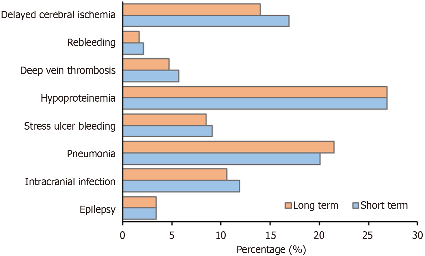 The χ2 test or Fisher’s exact test were used to examine categorical variables. Complications in hospital included seizure [3.4% (43/1268)], intracranial infection [11.2% (142/1268)], pneumonia [20.9% (265/1268)], stress ulcer bleeding [8.8% (111/1268)], hypoproteinemia [26.9% (341/1268)], deep vein thrombosis [5.1% (65/1268)], rebleeding [1.9% (24/1268)], and delayed cerebral ischemia [15.3% (194/1268)]. The incidence of complications during hospitalization between the short-term and long-term groups showed no statistically significant difference (P > 0.05). The incidence of complications during hospitalization is shown in Table 3 and Figure 2.