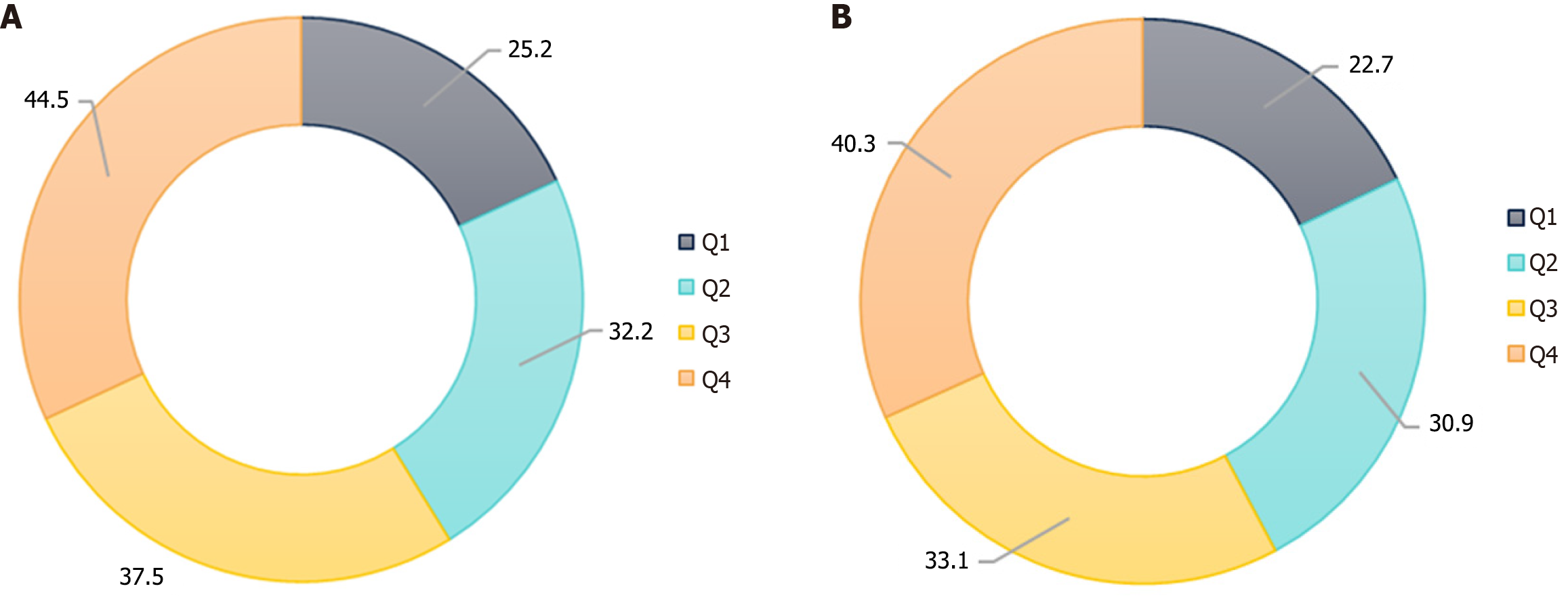 The mean depression score within the cohort was 7.4 ± 2.7. A total of 403 patients (31.8%) were found to have depressive symptoms, including 243 (19.2%) with mild depression, 128 (10.1%) with moderate depression, and 32 (2.5%) with severe depression. In the short-term follow-up group, depressive symptoms were identified in 153 patients [27.2% (153/562)], while in the long-term group, 250 individuals [35.4% (250/706)] were affected. The prevalence of depression was significantly higher in the long-term group compared to the short-term group (35.4% vs 27.2%, P = 0.002). Comprehensive statistical data on depression severity and distribution are presented in Table 5. In addition, the depression rate in the quartile array of follow-up time was 22.7% (72/317), 30.9% (98/317), 33.1% (105/317), and 40.3% (128/317). The statistical results of depression incidence at the four follow-up time points are shown in Figure 3B.