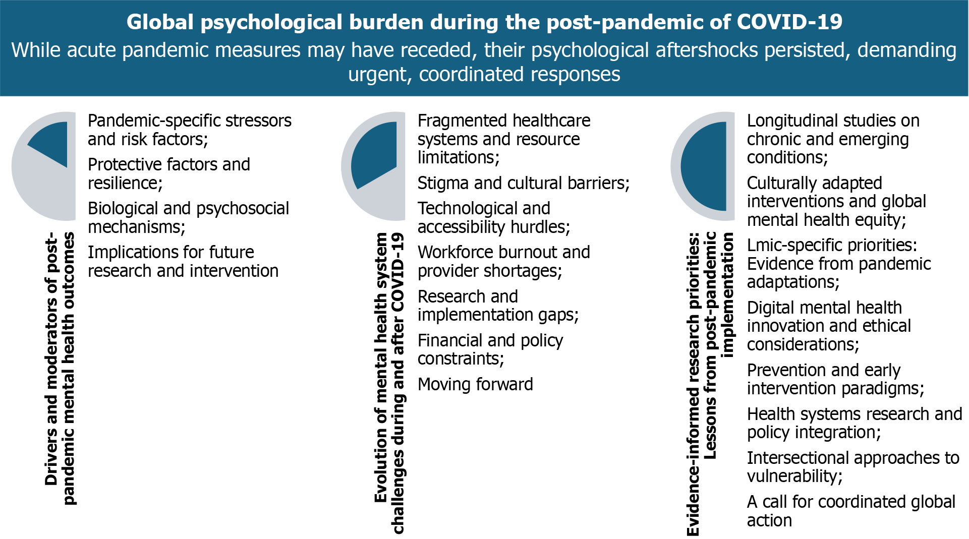 The COVID-19 pandemic has precipitated a lasting global mental health crisis that demands urgent, multifaceted solutions. This review underscores the disproportionate psychological burden borne by vulnerable populations and highlights critical areas for intervention: Integrating mental health into primary care systems, developing culturally adapted treatments, leveraging digital tools while addressing accessibility gaps, and implementing policy reforms to ensure sustainable funding (Figure 1). The pandemic has revealed both the fragility of existing mental healthcare systems and opportunities for transformative change. By synthesizing evidence on chronic outcomes and innovative solutions, this review fills critical gaps between acute-pandemic reports and emerging next-phase challenges, offering a roadmap for research prioritization. Moving forward, we must capitalize on this momentum by adopting evidence-based, equity-focused approaches that not only address current needs but also build resilience against future crises. The scale of this challenge calls for immediate, coordinated action across research, clinical practice, and policymaking to create mental healthcare systems capable of supporting population wellbeing in the post-pandemic era and beyond. To translate these research priorities into practice, we propose a three-tiered action framework: (1) Policy advocacy: Governments and World Health Organization should integrate mental health into pandemic preparedness plans, with dedicated funding for LMIC-specific interventions (e.g., task-shifting programs); (2) Researcher collaboration: Establish an international consortium to harmonize metrics (e.g., standardized long COVID neuropsychiatric assessments) and share datasets via platforms like the Global Mental Health Databank; and (3) Community engagement: Co-design interventions with marginalized groups (e.g., refugees, indigenous communities) using participatory methods. The post-COVID-19 mental health crisis demands a coordinated response, requiring researchers, policymakers, and communities must act now to avert a generational catastrophe.