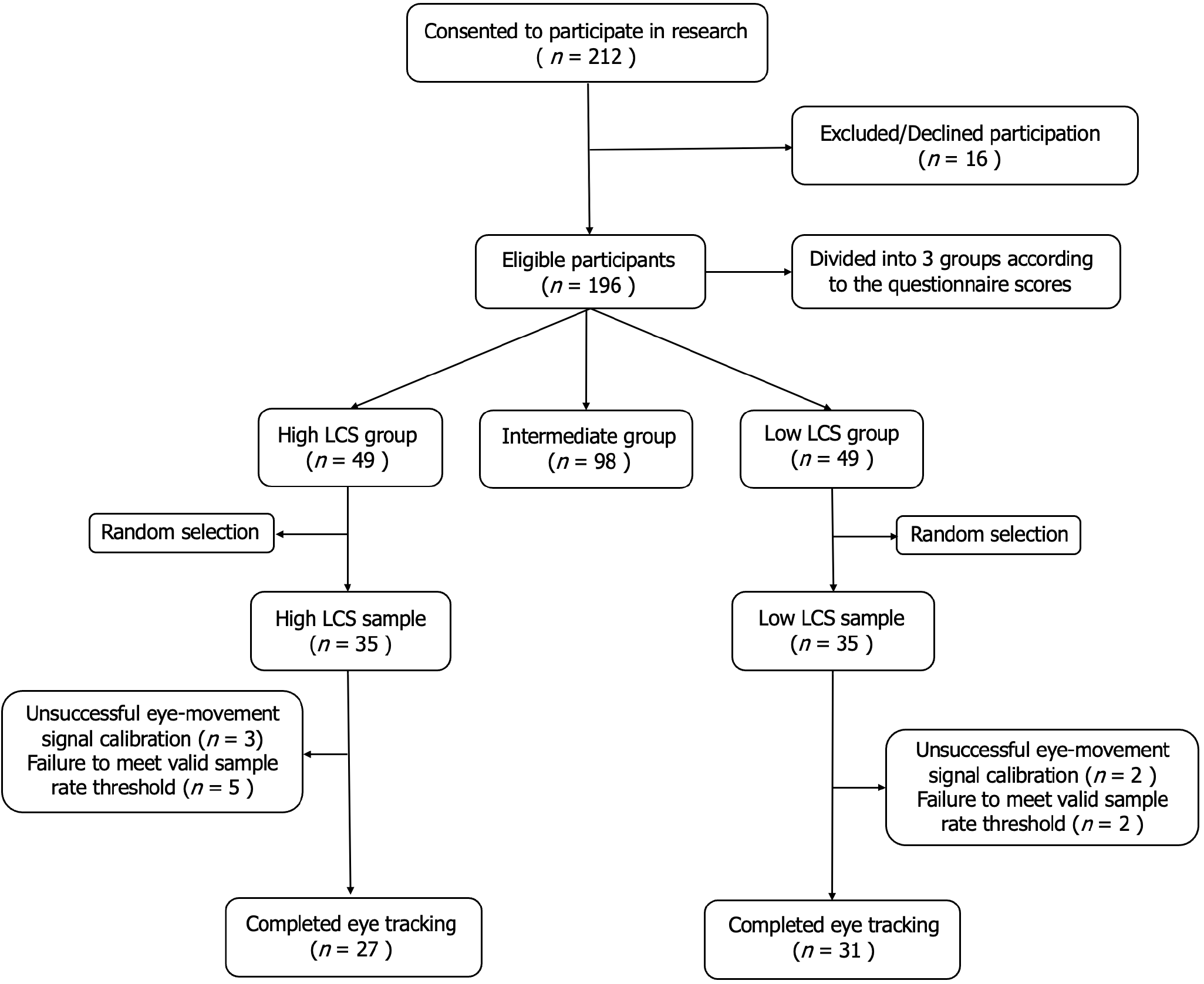Notably, eye-tracking indices demonstrate superior psychometric properties compared to reaction-time-based measures, particularly in quantifying threat-related attentional preferences[14,15]. Key metrics such as attentional bias ratios derived from eye-tracking have been empirically validated for their measurement reliability[16,17]. As a real-time measurement paradigm for capturing naturalistic attentional allocation, this technology provides a new perspective for exploring the attentional bias of individuals with different LCS. While this paradigm has been applied to examine attentional biases in anxious populations[17-19], critical temporal characteristics within the looming vulnerability model framework remain unexamined across differential LCS levels. Specifically, no studies have utilized eye-tracking to characterize how LCS profiles modulate dynamic attentional components (vigilance, maintenance, disengagement) toward threat stimuli.