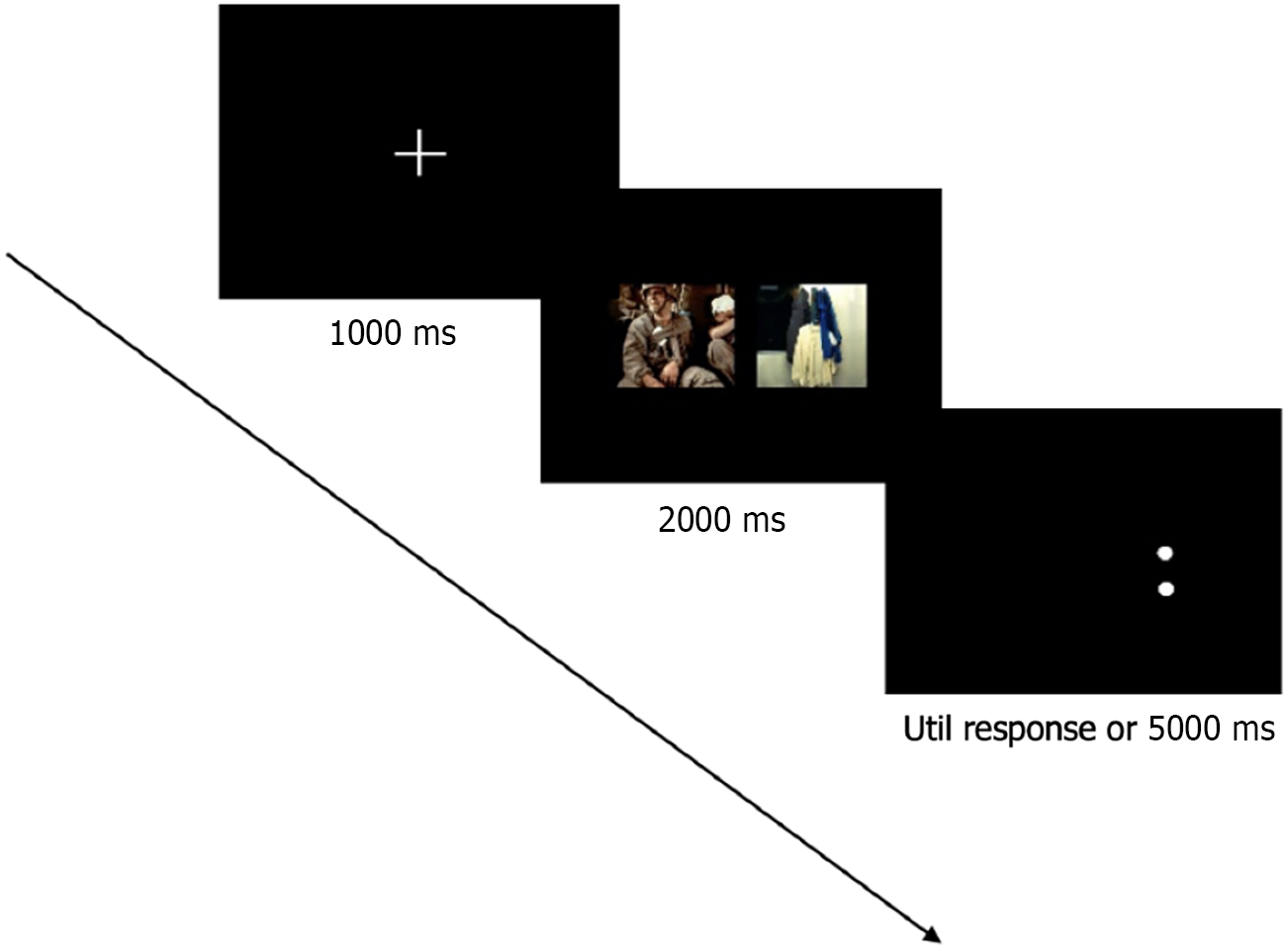 Each trial began with a 1000 ms central fixation cross (+) display, during which participants were instructed to maintain gaze at the screen center[24]. Following an introductory screen displaying instructions, two images appear side-by-side on the screen for 2000 ms[25]. After each pair of pictures will appear the symbol ":" or "..", when you see ":", press the F key, when you see ".." press the J key (Figure 2). Eye movement data were recorded continuously from fixation onset through response completion, with participants instructed to prioritize both speed and accuracy in their judgments.