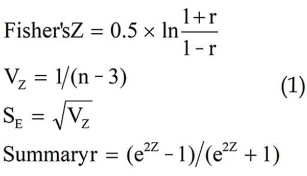 For studies using Pearson correlation analysis, when combining the effect sizes, the correlation coefficient needed to be transformed into Fisher’s Z, as shown in formula (1). For the 95%CI, the lower and upper limits of the value were Zlower and Zupper, respectively, and the 2-sided critical value = 1.96, as shown in formula (2).
