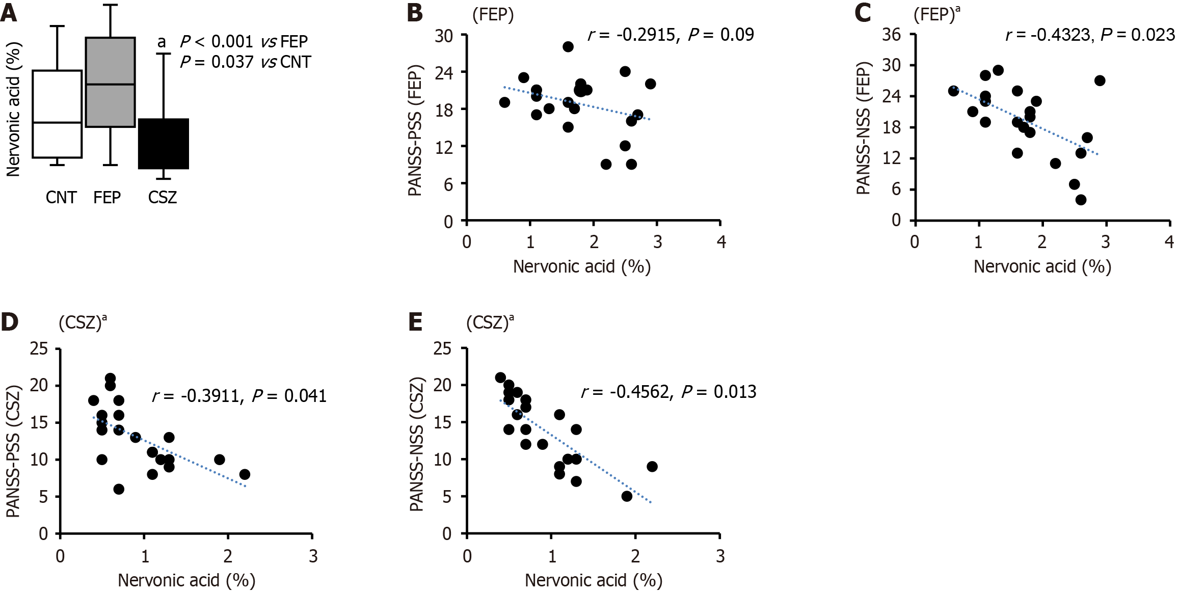 Figure 1 Statistical analyses of erythrocyte membrane nervonic acid level and its association with psychopathology in schizophrenia.aP < 0.05 was considered significant. A: The level of erythrocyte membrane nervonic acid (NA) was non-significantly elevated in patients with first-episode psychosis (FEP) (grey bar) compared to the control subjects (empty bar). However, membrane NA level was significantly reduced in medicated patients with chronic schizophrenia compared to both the control subjects and FEP patients (black bar); B: In patients with FEP, erythrocyte membrane NA did not show significant association with positive and negative syndrome scale (PANSS)-positive symptom scores; C: It showed significantly negative association with PANSS-negative symptom scores; D: In chronic schizophrenia patients, erythrocyte membrane NA showed significant negative association with both PANSS-positive symptom scores; E: PANSS-negative symptom scores. CNT: Control; FEP: First-episode psychosis; CSZ: Chronic schizophrenia; PANSS-PSS: Positive and negative syndrome scale-positive symptom score; PANSS-NSS: Positive and negative syndrome scale-negative symptom score.